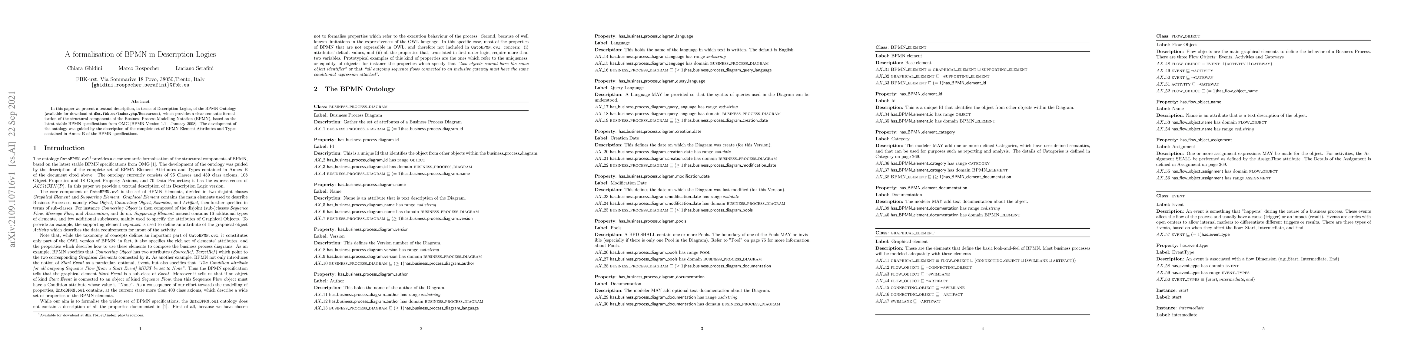 This paper formalizes the BPMN Ontology using Description Logics, providing a semantic representation of BPMN's structural components based on the latest OMG specifications. The ontology is developed from the detailed attributes and types defined in BPMN's Annex B.