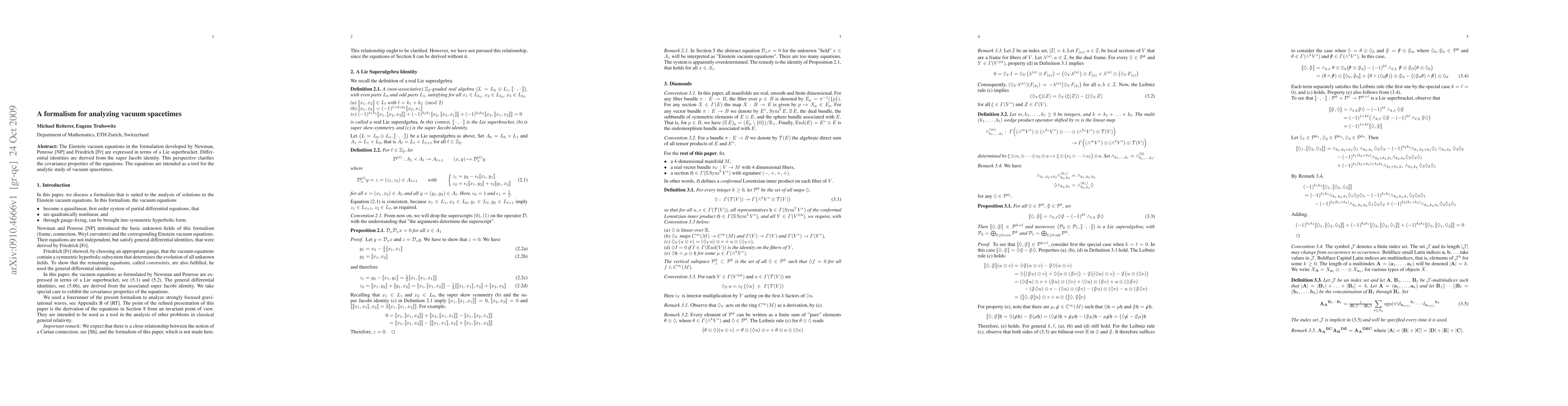 The Einstein vacuum equations in the formulation developed by Newman, Penrose [NP] and Friedrich [Fr] are expressed in terms of a Lie superbracket. Differential identities are derived from the super Jacobi identity. This perspective clarifies the covariance properties of the equations. The equations are intended as a tool for the analytic study of vacuum spacetimes.