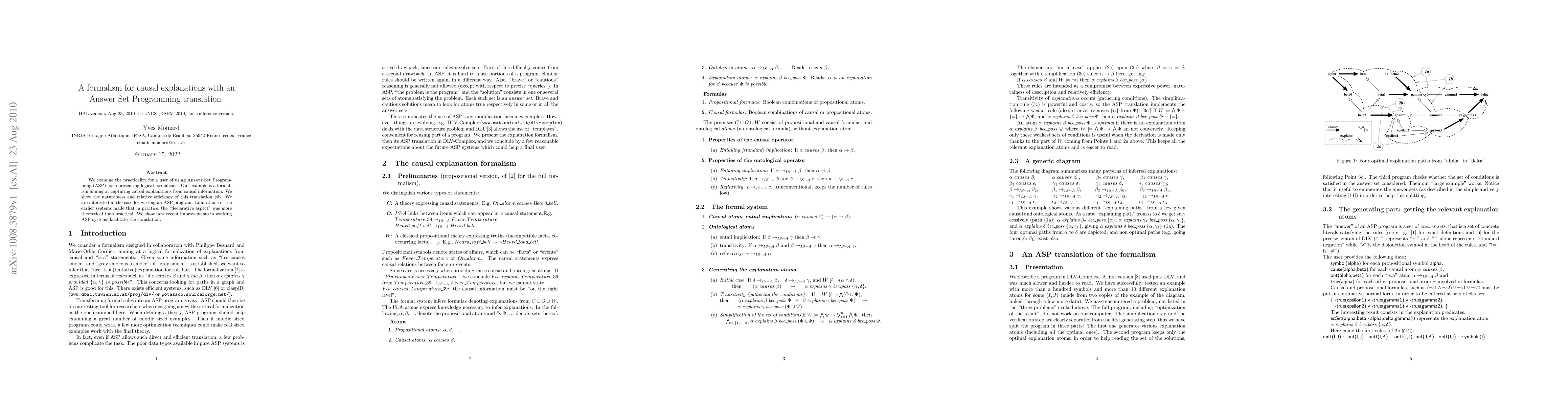 We examine the practicality for a user of using Answer Set Programming (ASP) for representing logical formalisms. Our example is a formalism aiming at capturing causal explanations from causal information. We show the naturalness and relative efficiency of this translation job. We are interested in the ease for writing an ASP program. Limitations of the earlier systems made that in practice, the ``declarative aspect'' was more theoretical than practical. We show how recent improvements in working ASP systems facilitate the translation.