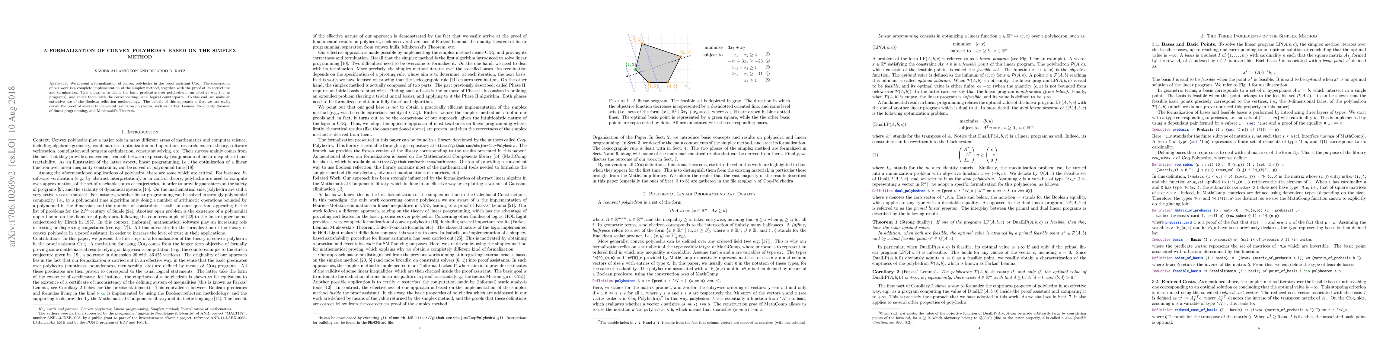 This paper formalizes convex polyhedra in Coq, leveraging a complete implementation of the simplex method to prove its correctness and termination. This approach enables the derivation of proofs for fundamental results like Farkas' Lemma and Minkowski's Theorem.