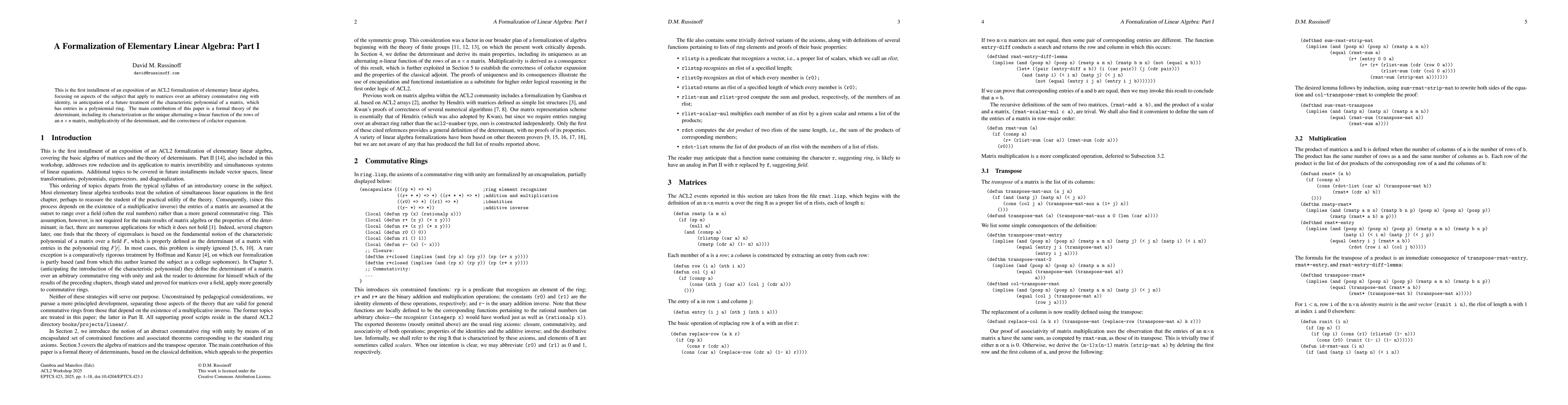 This is the first installment of an exposition of an ACL2 formalization of elementary linear algebra, focusing on aspects of the subject that apply to matrices over an arbitrary commutative ring with identity, in anticipation of a future treatment of the characteristic polynomial of a matrix, which has entries in a polyniomial ring. The main contribution of this paper is a formal theory of the determinant, including its characterization as the unique alternating n-linear function of the rows of an non matrix, multiplicativity of the determinant, and the correctness of cofactor expansion.