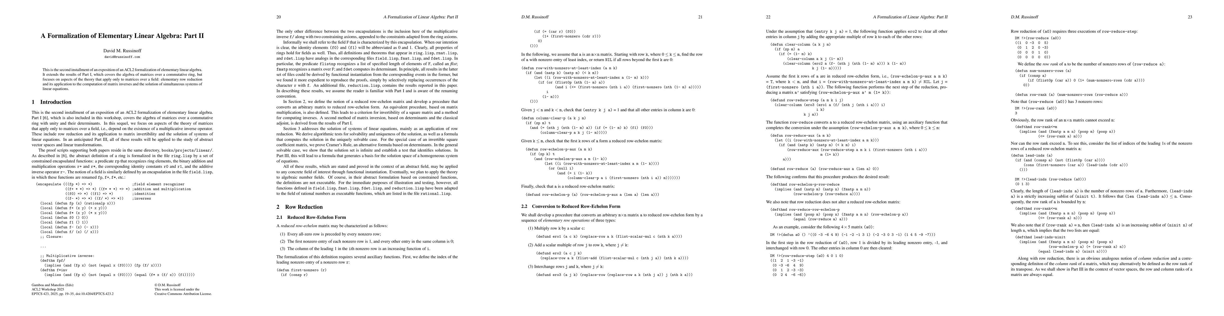 This paper, Part II of a series, builds on the formalization of linear algebra over commutative rings presented in Part I. It specifically delves into the application of elementary row operations to matrices over fields, detailing methods for computing matrix inverses and solving systems of linear equations.