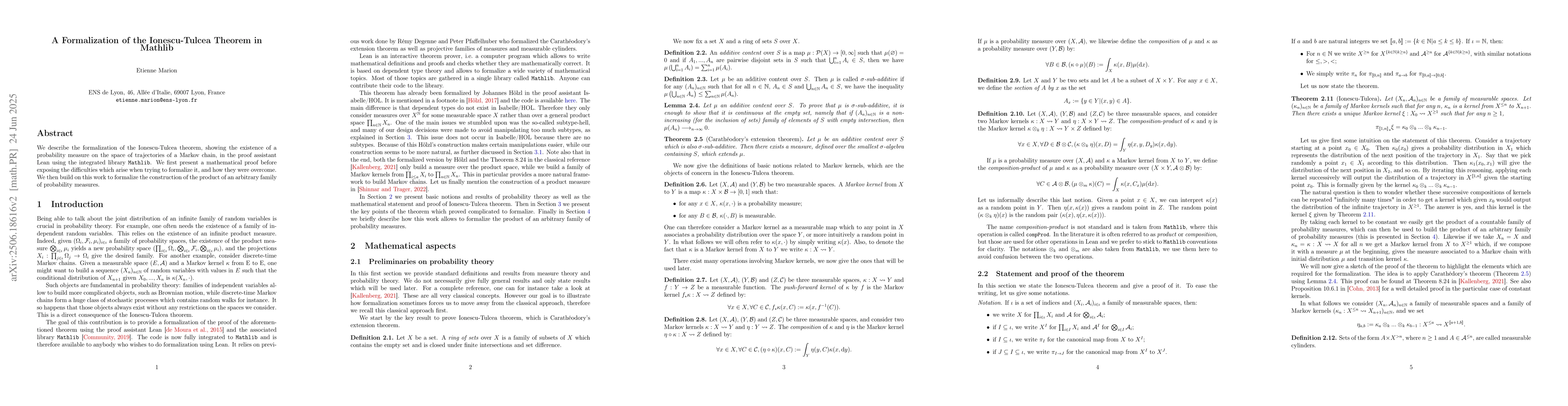 The paper introduces a formalization of the Ionescu-Tulcea theorem and its extension to the product of an arbitrary family of probability measures in Lean's Mathlib, including explicit isomorphisms to handle kernel composition and marginal integrals to avoid subtype issues.