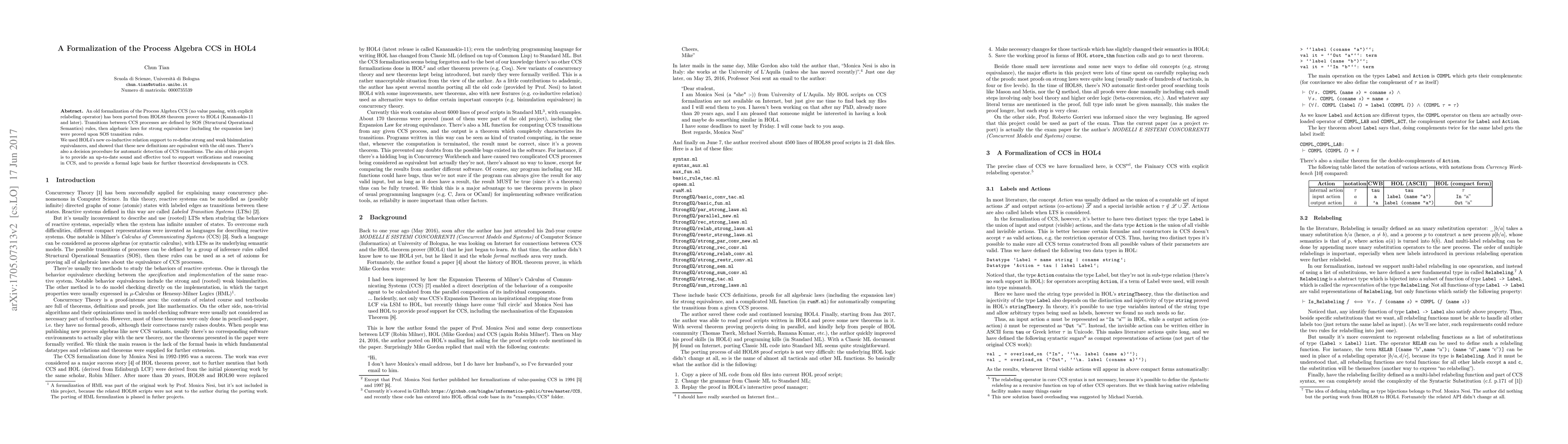 This paper formalizes the Process Algebra CCS in HOL4, porting an existing formalization from HOL88 to HOL4. It employs SOS inference rules to define transitions and proves algebraic laws, leveraging HOL4's co-inductive relations to redefine bisimulation equivalences, and introduces a decision procedure for automatic CCS transition detection.