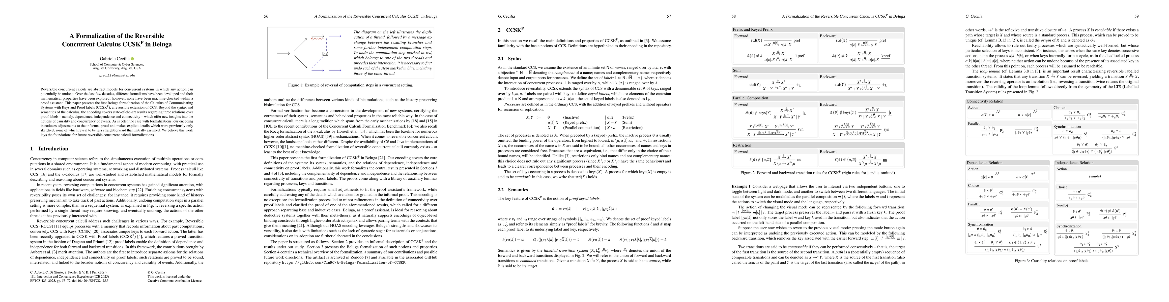 Reversible concurrent calculi are abstract models for concurrent systems in which any action can potentially be undone. Over the last few decades, different formalisms have been developed and their mathematical properties have been explored; however, none have been machine-checked within a proof assistant. This paper presents the first Beluga formalization of the Calculus of Communicating Systems with Keys and Proof labels (CCSKP), a reversible extension of CCS. Beyond the syntax and semantics of the calculus, the encoding covers state-of-the-art results regarding three relations over proof labels -- namely, dependence, independence and connectivity -- which offer new insights into the notions of causality and concurrency of events. As is often the case with formalizations, our encoding introduces adjustments to the informal proof and makes explicit details which were previously only sketched, some of which reveal to be less straightforward than initially assumed. We believe this work lays the foundations for future reversible concurrent calculi formalizations.