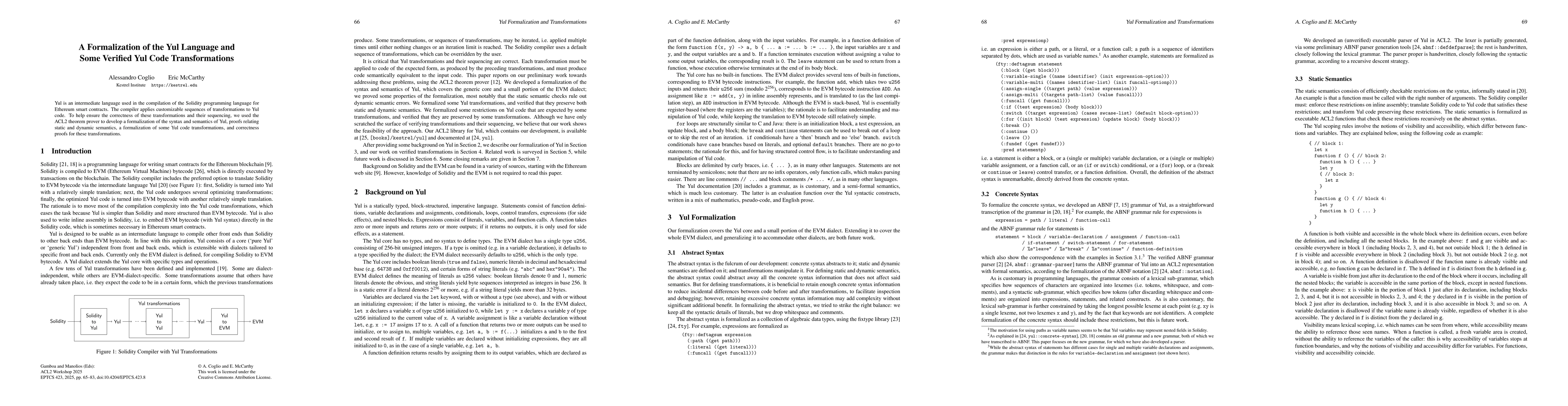 Yul is an intermediate language used in the compilation of the Solidity programming language for Ethereum smart contracts. The compiler applies customizable sequences of transformations to Yul code. To help ensure the correctness of these transformations and their sequencing, we used the ACL2 theorem prover to develop a formalization of the syntax and semantics of Yul, proofs relating static and dynamic semantics, a formalization of some Yul code transformations, and correctness proofs for these transformations.