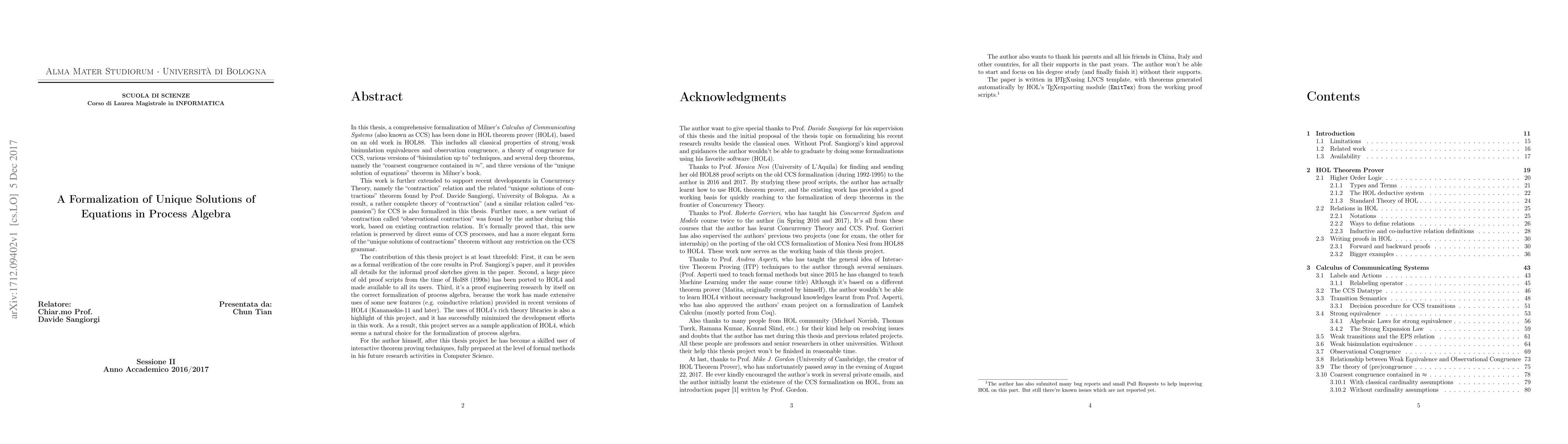 This paper formalizes Milner's Calculus of Communicating Systems (CCS) in HOL theorem prover, including bisimulation equivalences and unique solutions of equations. It extends the theory to include the "contraction" relation and proves a new "observational contraction" variant, demonstrating its elegance and preservation properties.