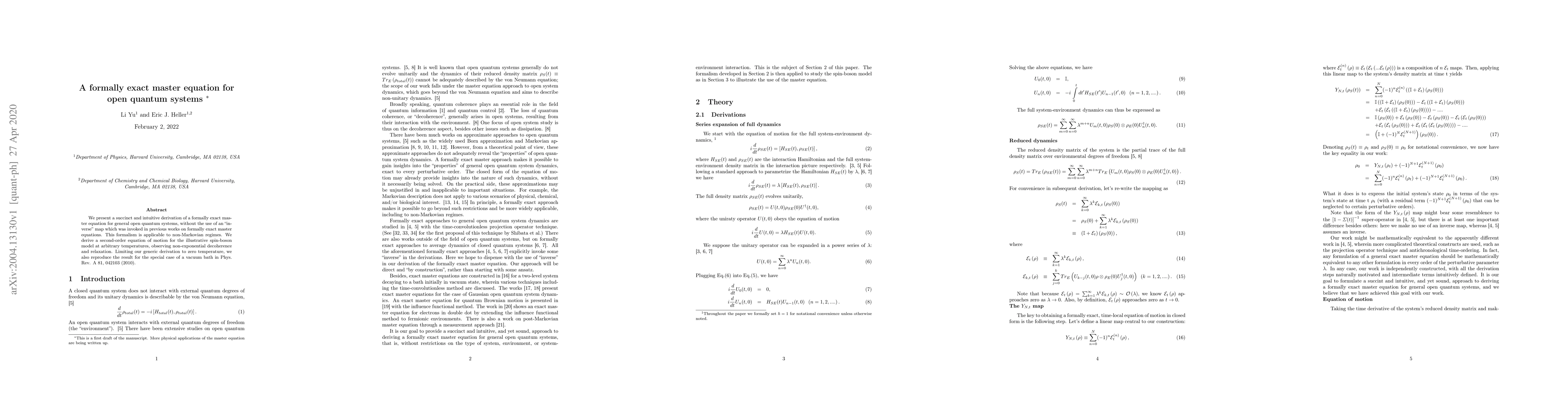 We present a succinct and intuitive derivation of a formally exact master equation for general open quantum systems, without the use of an "inverse" map which was invoked in previous works on formally exact master equations. This formalism is applicable to non-Markovian regimes. We derive a second-order equation of motion for the illustrative spin-boson model at arbitrary temperatures, observing non-exponential decoherence and relaxation. Limiting our generic derivation to zero temperature, we also reproduce the result for the special case of a vacuum bath in Phys. Rev. A 81, 042103 (2010).