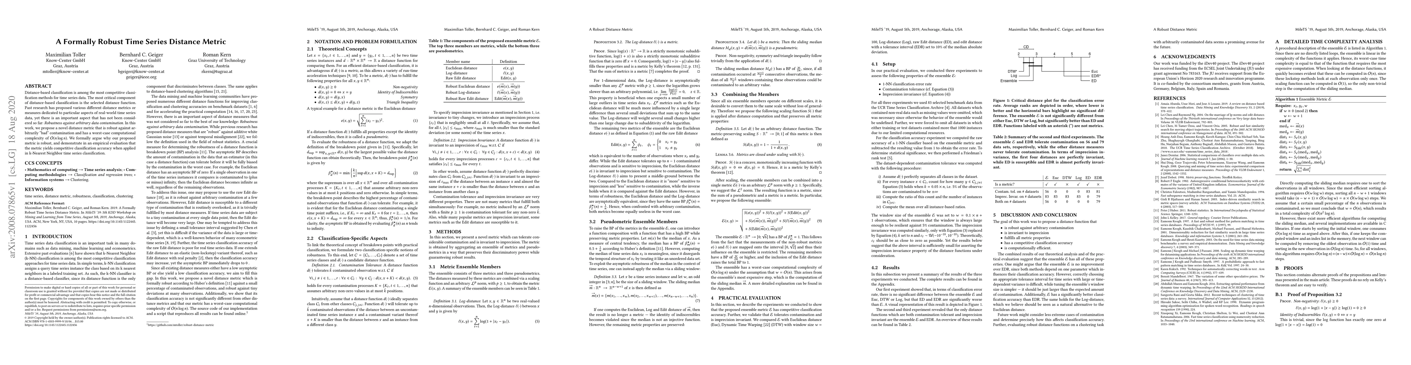 This paper introduces a novel time series distance metric robust against arbitrary data contamination, ensuring worst-case computational complexity of $\mathcal{O}(n\log n)$. The proposed metric is formally proven to be robust and demonstrates competitive classification accuracy in k-Nearest Neighbor time series classification.
