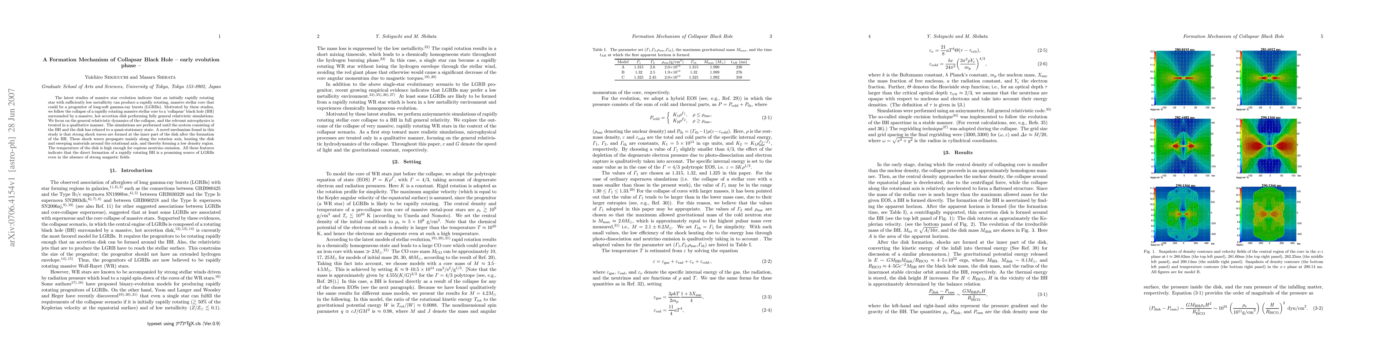The latest studies of massive star evolution indicate that an initially rapidly rotating star with sufficiently low metallicity can produce a rapidly rotating, massive stellar core that could be a progenitor of long-soft gamma-ray bursts (LGRBs). Motivated by these studies, we follow the collapse of a rapidly rotating massive stellar core to a 'collapsar' black hole (BH) surrounded by a massive, hot accretion disk performing fully general relativistic simulations. We focus on the general relativistic dynamics of the collapse, and the relevant microphysics is treated in a qualitative manner. The simulations are performed until the system consisting of the BH and the disk has relaxed to a quasi-stationary state. A novel mechanism found in this study is that strong shock waves are formed at the inner part of the disk after the formation of the BH. These shock waves propagate mainly along the rotation axis, heating the disk and sweeping materials around the rotational axis, and thereby forming a low density region. The temperature of the disk is high enough for copious neutrino emission. All these features indicate that the direct formation of a rapidly rotating BH is a promising source of LGRBs even in the absence of strong magnetic fields.