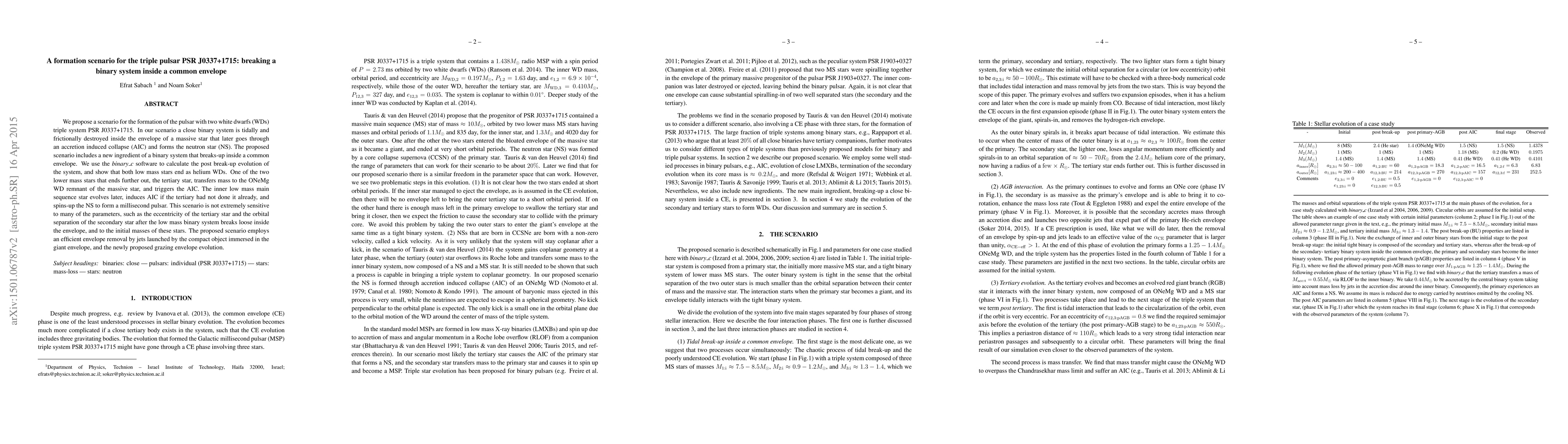 We propose a scenario for the formation of the pulsar with two white dwarfs (WDs) triple system PSR J0337+1715. In our scenario a close binary system is tidally and frictionally destroyed inside the envelope of a massive star that later goes through an accretion induced collapse (AIC) and forms the neutron star (NS). The proposed scenario includes a new ingredient of a binary system that breaks-up inside a common envelope. We use the binary c software to calculate the post break-up evolution of the system, and show that both low mass stars end as helium WDs. One of the two lower mass stars that ends further out, the tertiary star, transfers mass to the ONeMg WD remnant of the massive star, and triggers the AIC. The inner low mass main sequence star evolves later, induces AIC if the tertiary had not done it already, and spins-up the NS to form a millisecond pulsar. This scenario is not extremely sensitive to many of the parameters, such as the eccentricity of the tertiary star and the orbital separation of the secondary star after the low mass binary system breaks loose inside the envelope, and to the initial masses of these stars. The proposed scenario employs an efficient envelope removal by jets launched by the compact object immersed in the giant envelope, and the newly proposed grazing envelope evolution.