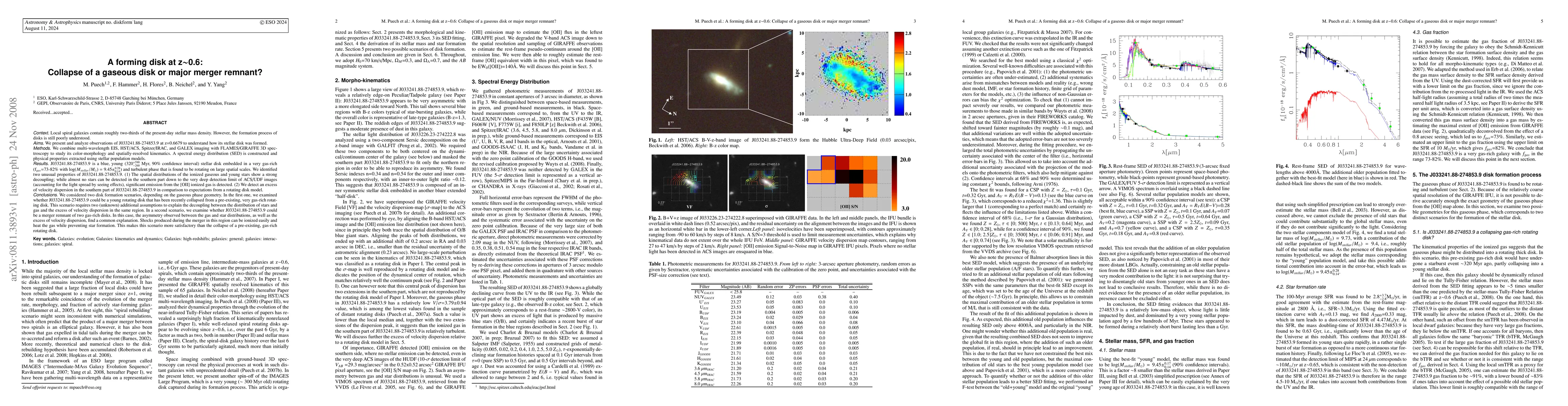 This paper investigates J033241.88-274853.9 at z~0.668, finding a young, gas-rich stellar disk with unusual properties. The authors propose two scenarios: a collapsed disk or a merger remnant, with the latter better explaining the observed decoupling of stars and gas and the excess velocity dispersion.