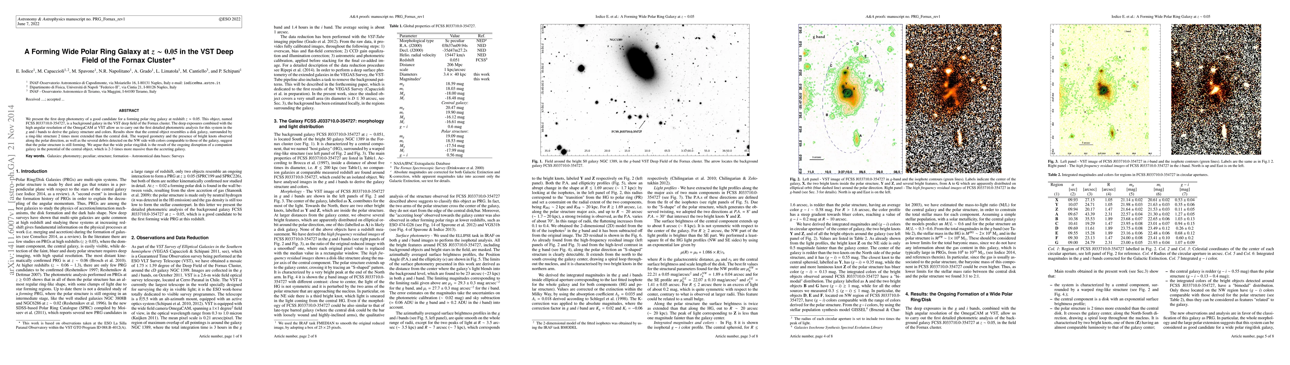 This paper reports the first deep photometric analysis of a forming polar ring galaxy, FCSS J033710.0-354727, in the Fornax cluster at redshift z~0.05. The study reveals a central disk galaxy surrounded by a wide, forming polar ring, suggesting an ongoing disruption of a companion galaxy.