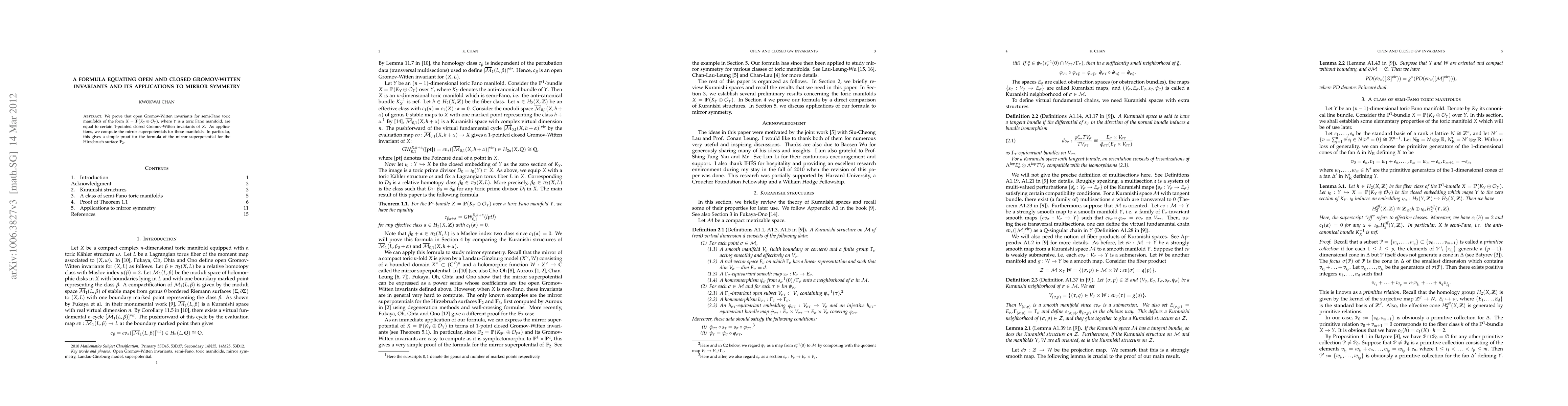 Summary: The paper establishes an equivalence between open and closed Gromov-Witten invariants for specific semi-Fano toric manifolds, facilitating the computation of their mirror superpotentials, including a simplified proof for the Hirzebruch surface $\mathbb{F}_2$'s mirror superpotential.