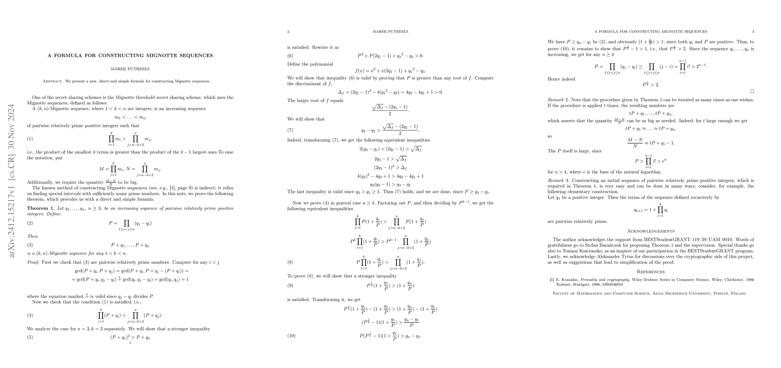 Summary: The paper introduces a straightforward and direct formula for the construction of Mignotte sequences, offering a simpler approach compared to existing methods.