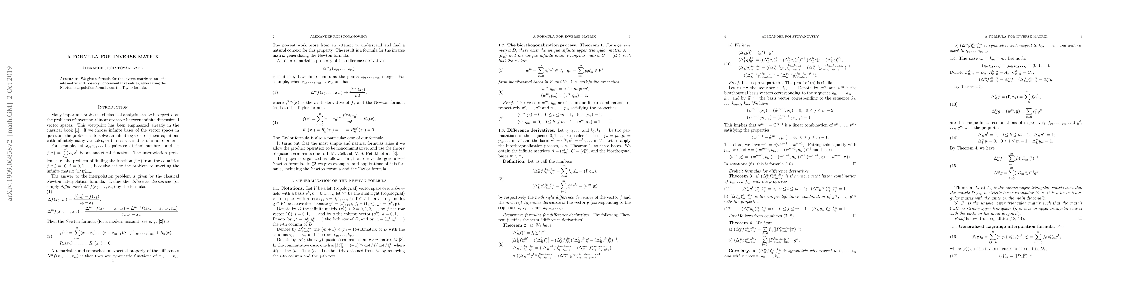 We give a formula for the inverse matrix to an infinite matrix with possibly noncommutative entries, generalizing the Newton interpolation formula and the Taylor formula.