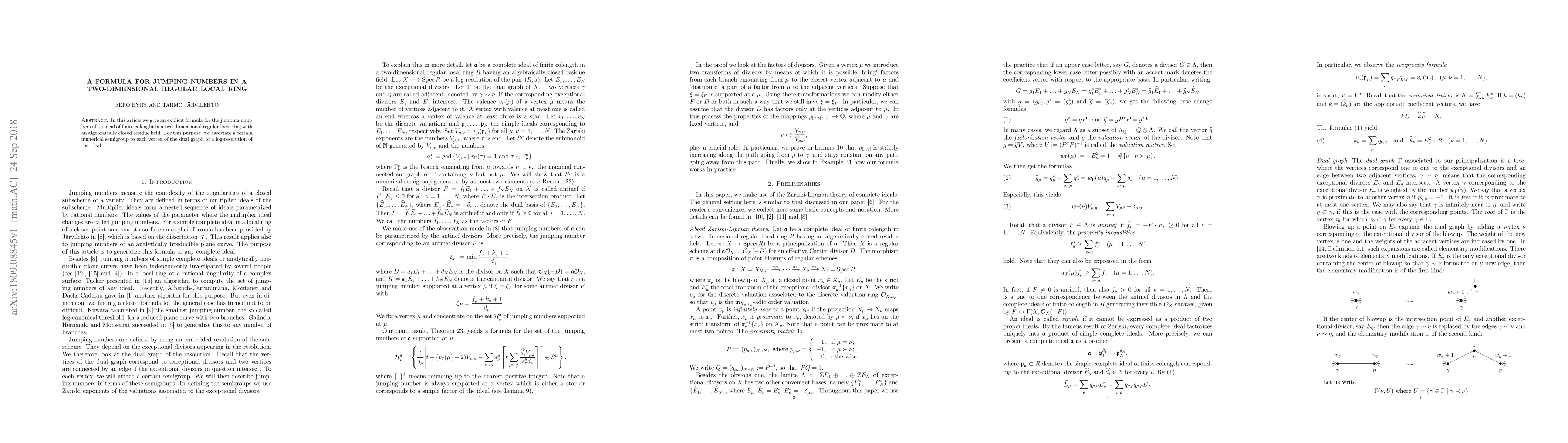 The paper presents an explicit formula for jumping numbers of an ideal of finite colength in a two-dimensional regular local ring with an algebraically closed residue field, using numerical semigroups associated with vertices of the dual graph of a log-resolution of the ideal.