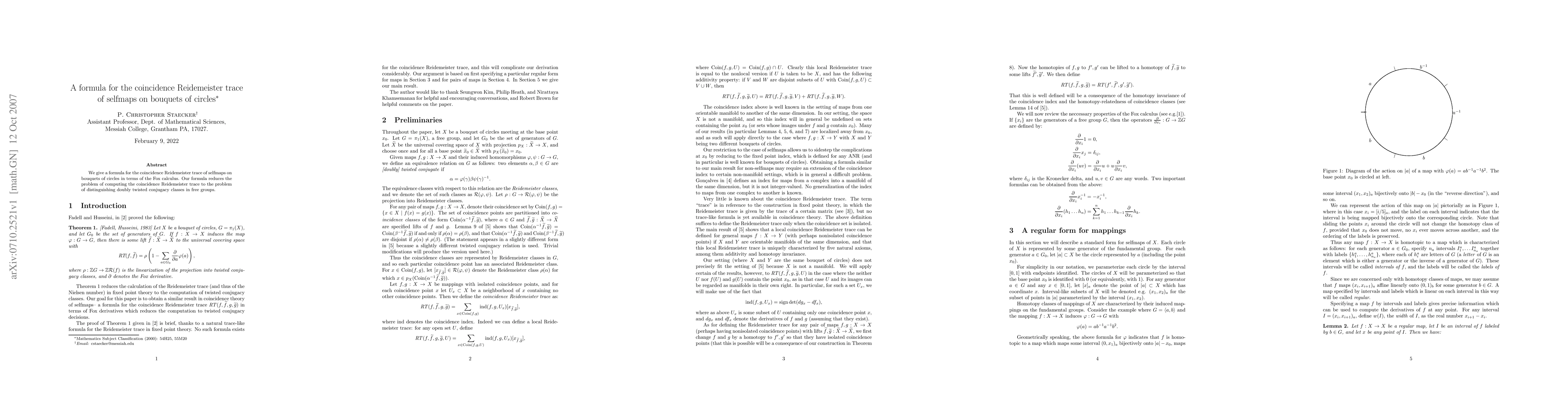 Summary: The paper presents a formula for the coincidence Reidemeister trace of selfmaps on bouquets of circles using the Fox calculus, simplifying the computation to distinguishing doubly twisted conjugacy classes in free groups.