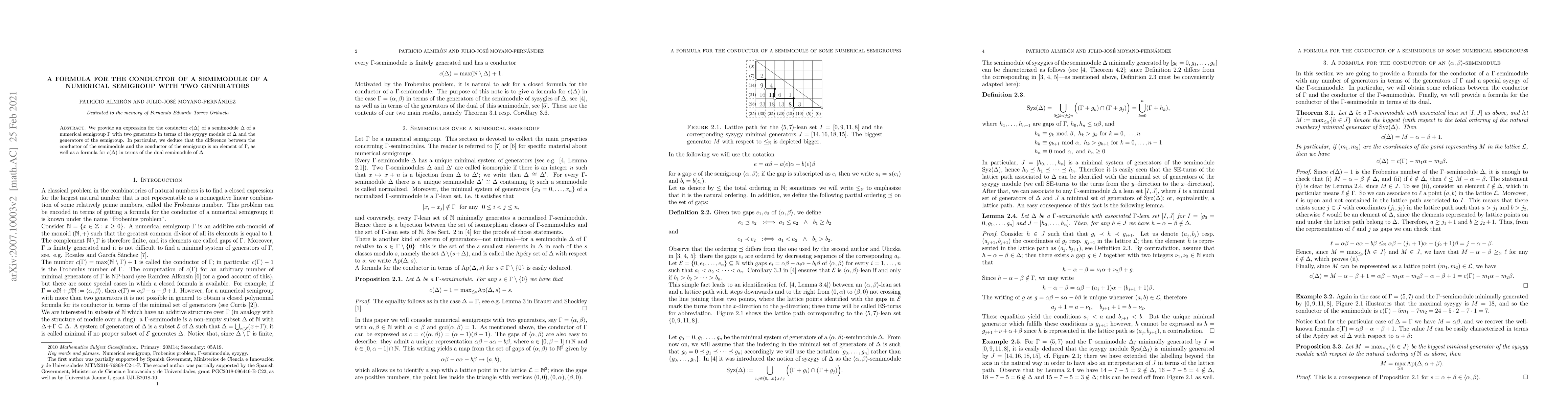 Summary: The paper derives a formula for the conductor of a semimodule of a numerical semigroup with two generators, linking it to the syzygy module and semigroup generators, and establishes that the difference between the semimodule and semigroup conductors is an element of the semigroup.
