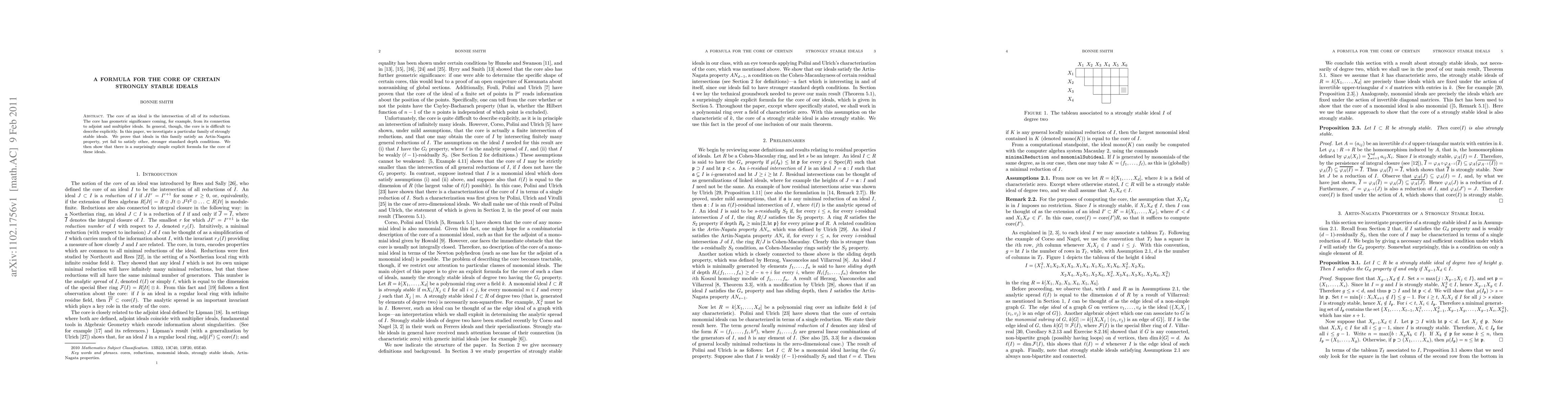 The core of an ideal is the intersection of all of its reductions. The core has geometric significance coming, for example, from its connection to adjoint and multiplier ideals. In general, though, the core is difficult to describe explicitly. In this paper, we investigate a particular family of strongly stable ideals. We prove that ideals in this family satisfy an Artin-Nagata property, yet fail to satisfy other, stronger standard depth conditions. We then show that there is a surprisingly simple explicit formula for the core of these ideals.