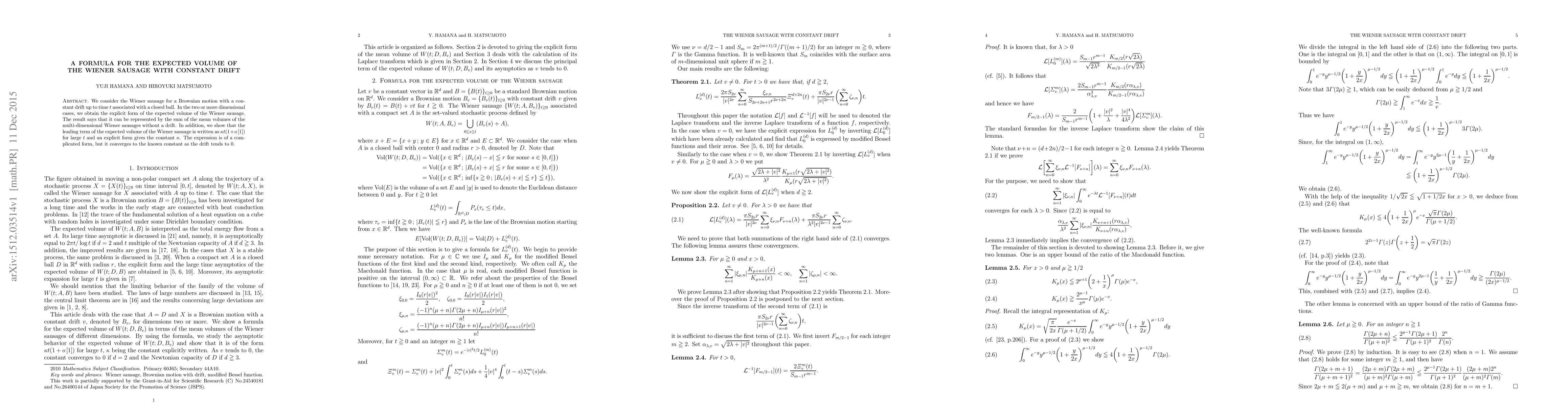 This paper derives an explicit formula for the expected volume of a Wiener sausage with constant drift in two or more dimensions, showing it can be represented by the sum of mean volumes of sausages without drift. The leading term of the expected volume is $\kappa t(1+o[1])$ for large $t$, with an explicit expression for $\kappa$ that converges to a known constant as drift approaches zero.