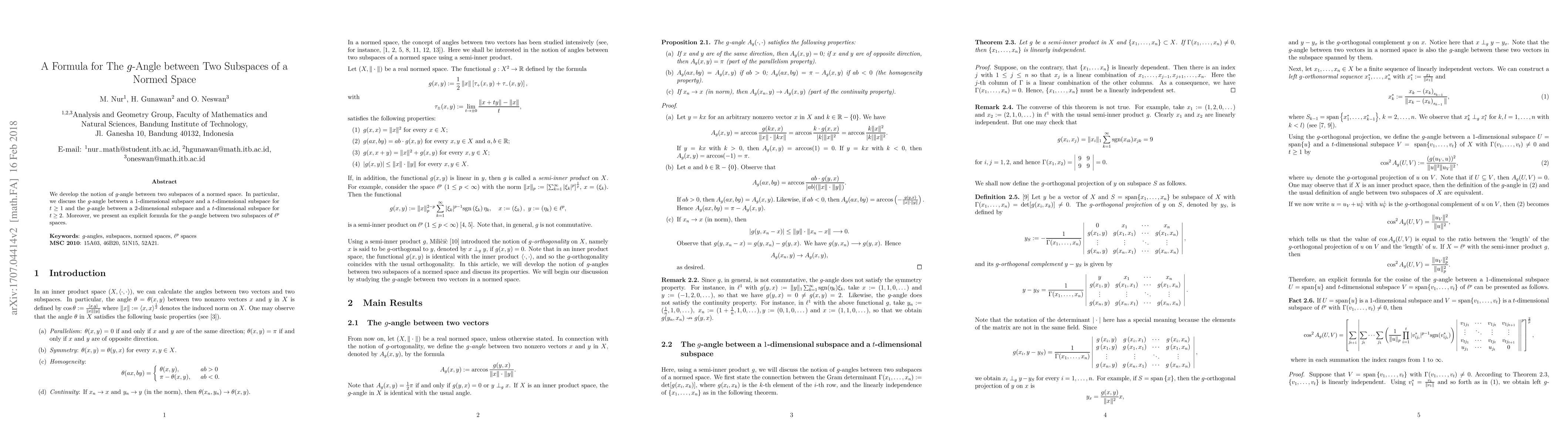 We develop the notion of $g$-angle between two subspaces of a normed space. In particular, we discuss the $g$-angle between a $1$-dimensional subspace and a $t$-dimensional subspace for $t\geq 1$ and the $g$-angle between a $2$-dimensional subspace and a $t$-dimensional subspace for $t\geq 2$. Moreover, we present an explicit formula for the $g$-angle between two subspaces of $\ell^{p}$ spaces.