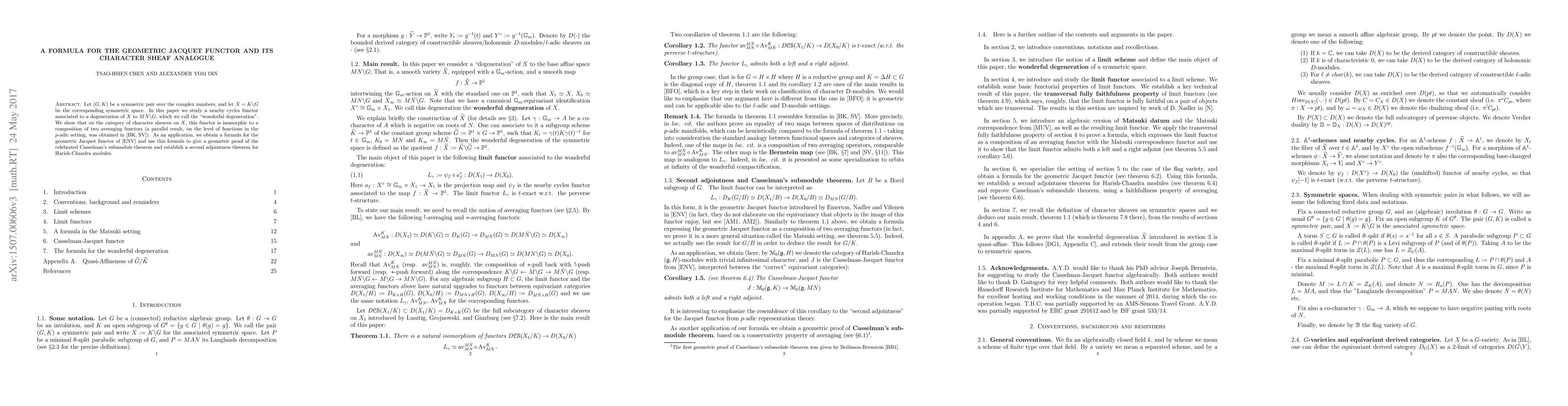 This paper establishes an isomorphism between a nearby cycles functor and a composition of two averaging functors on character sheaves of a symmetric space, derived from the "wonderful degeneration." It also provides a geometric formula for the geometric Jacquet functor and uses it to prove Casselman's submodule theorem and establish a second adjointness theorem for Harish-Chandra modules.