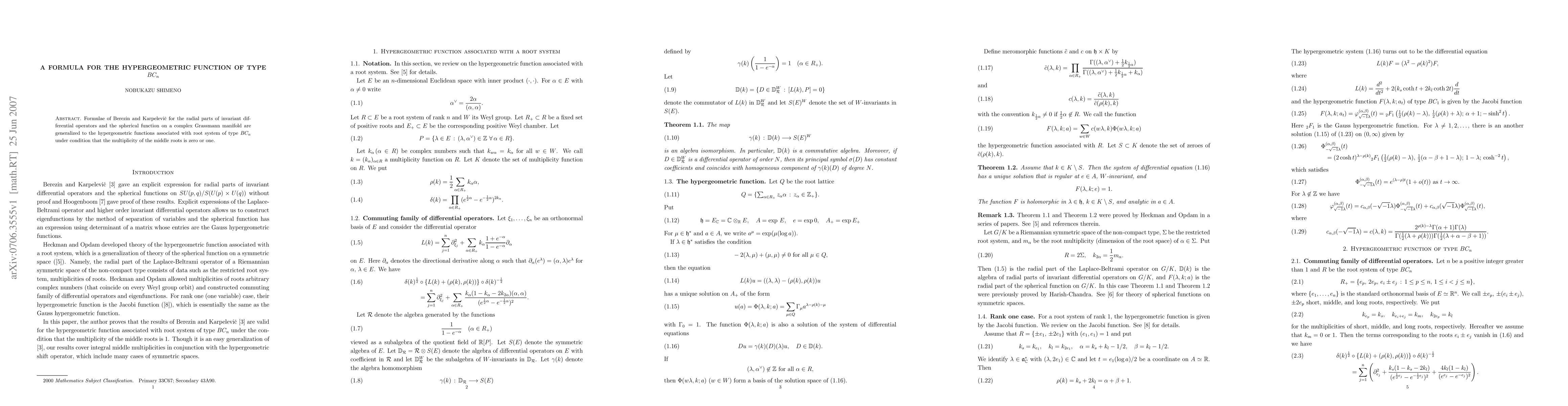 Formulae of Berezin and Karpelevic for the radial parts of invariant differential operators and the spherical function on a complex Grassmann manifold are generalized to the hypergeometric functions associated with root system of type $BC_n$ under condition that the multiplicity of the middle roots is zero or one.