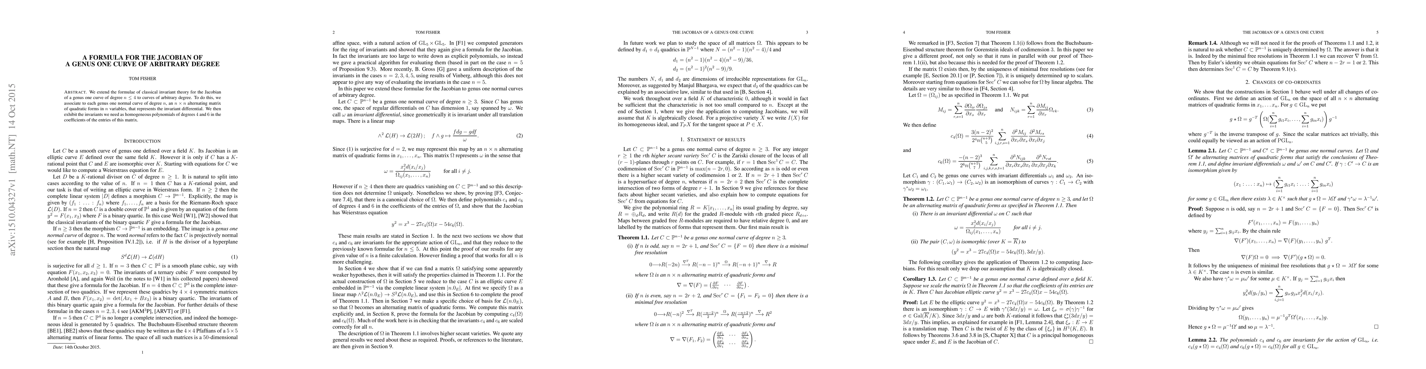 This paper extends classical invariant theory to derive a formula for the Jacobian of genus one curves of any degree. It introduces an $n \times n$ alternating matrix of quadratic forms to represent the invariant differential, revealing homogeneous invariants of degrees $4$ and $6$.