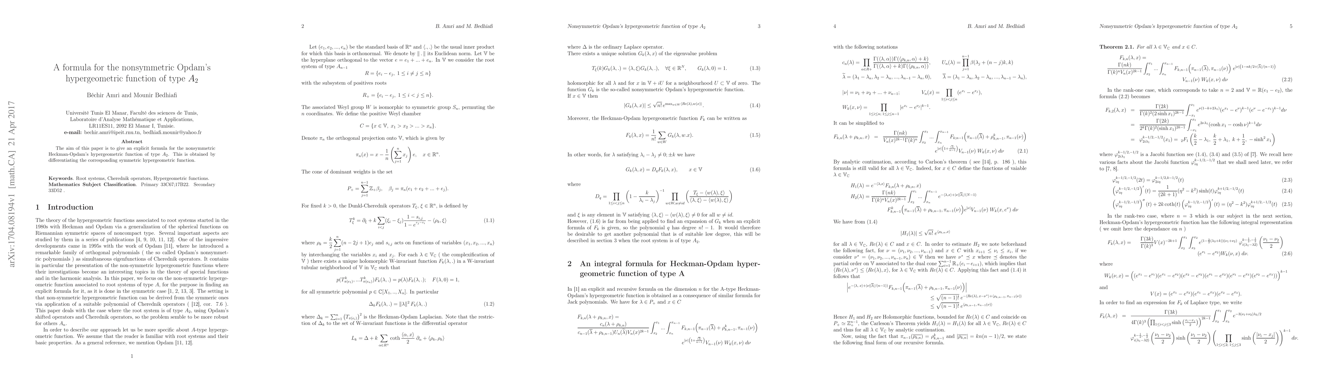 Researchers developed an explicit formula for the nonsymmetric Heckman-Opdam's hypergeometric function of type $A_2$, derived from its symmetric counterpart through differentiation.