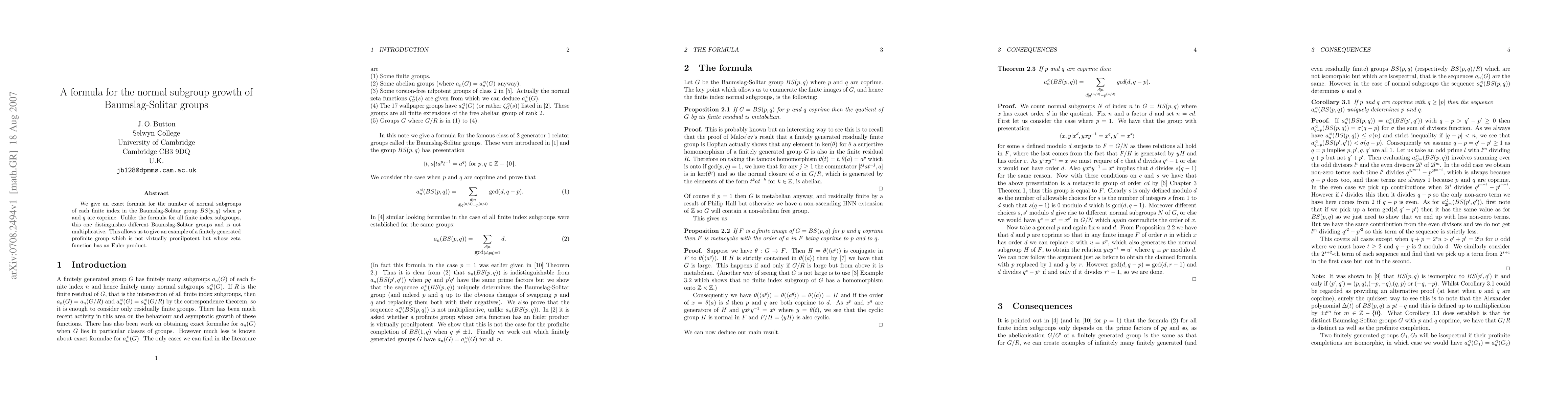 The research provides an exact formula for the number of normal subgroups of each finite index in the Baumslag-Solitar group BS(p,q) when p and q are coprime, distinguishing different Baumslag-Solitar groups and not being multiplicative.
