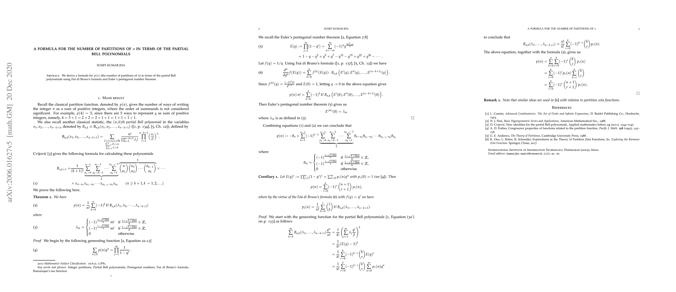 We derive a formula for $p(n)$ (the number of partitions of $n$) in terms of the partial Bell polynomials using Fa\`{a} di Bruno's formula and Euler's pentagonal number theorem.