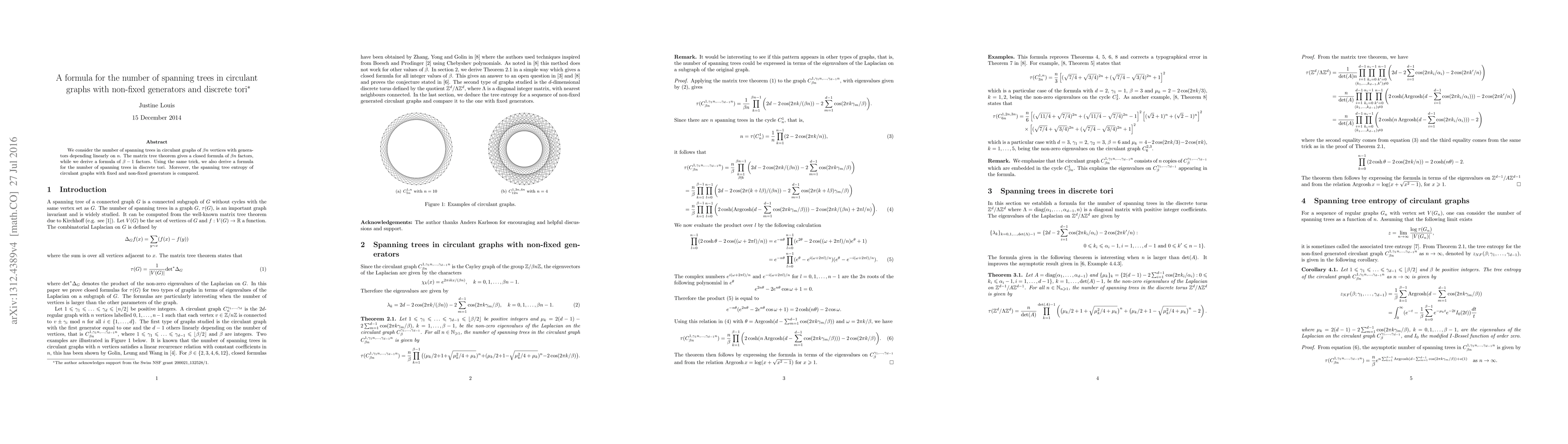 Summary: This paper derives a formula for the number of spanning trees in circulant graphs with non-fixed generators, reducing the complexity from $\beta n$ to $\beta-1$ factors. It also extends the approach to discrete tori and compares spanning tree entropy between circulant graphs with fixed and non-fixed generators.