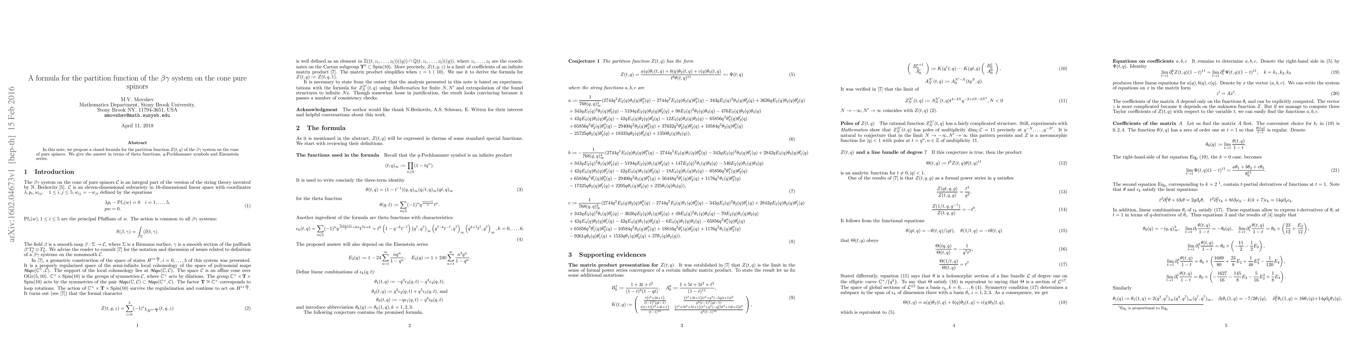 Summary: This paper proposes a closed formula for the partition function $Z(t,q)$ of the $\beta\gamma$ system on the cone of pure spinors, expressed using theta functions, $q$-Pochhammer symbols, and Eisenstein series. The formula provides a new analytical approach to the system.
