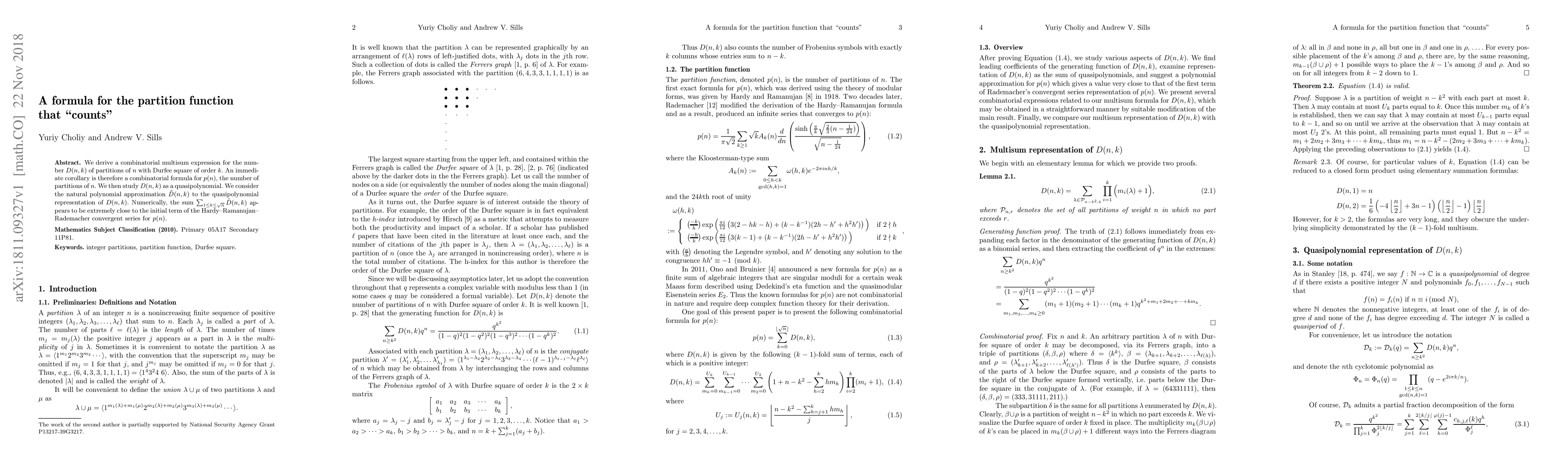 We derive a combinatorial multisum expression for the number $D(n,k)$ of partitions of $n$ with Durfee square of order $k$. An immediate corollary is therefore a combinatorial formula for $p(n)$, the number of partitions of $n$. We then study $D(n,k)$ as a quasipolynomial. We consider the natural polynomial approximation $\tilde{D}(n,k)$ to the quasipolynomial representation of $D(n,k)$. Numerically, the sum $\sum_{1\leq k \leq \sqrt{n}} \tilde{D}(n,k)$ appears to be extremely close to the initial term of the Hardy--Ramanujan--Rademacher convergent series for $p(n)$.