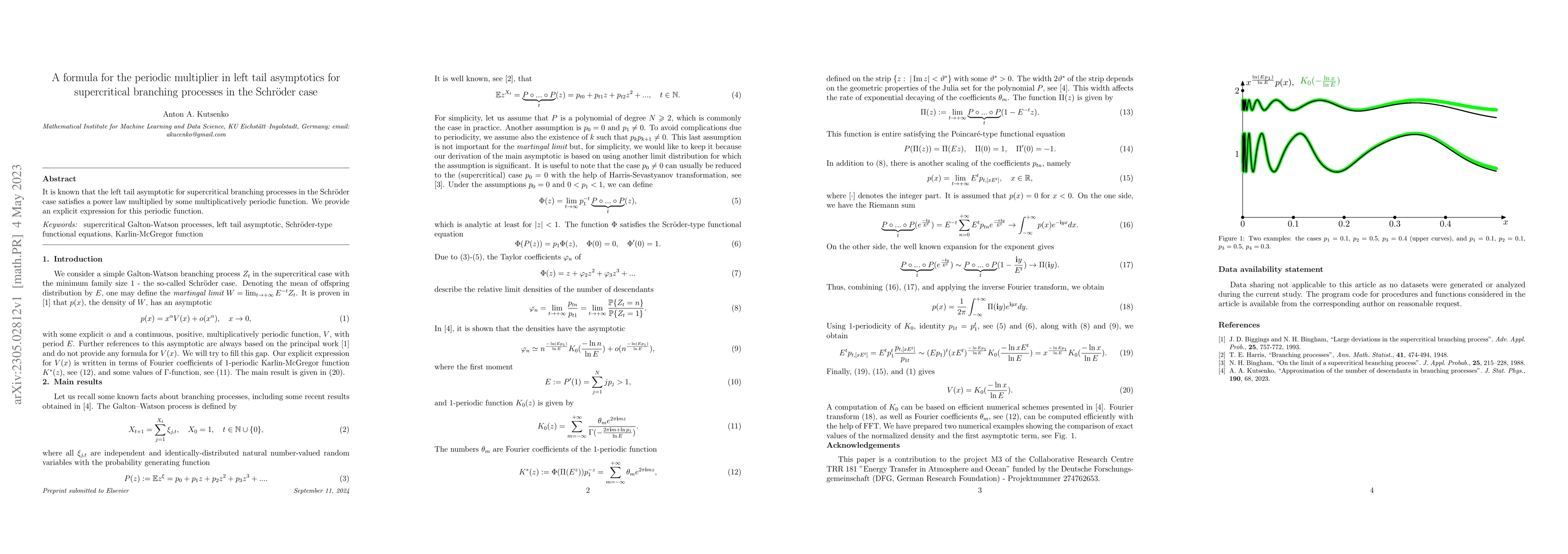 Summary: This paper derives an explicit formula for the periodic multiplier in the left tail asymptotics of supercritical branching processes in the Schröder case, revealing the multiplicatively periodic function that governs the power law behavior.