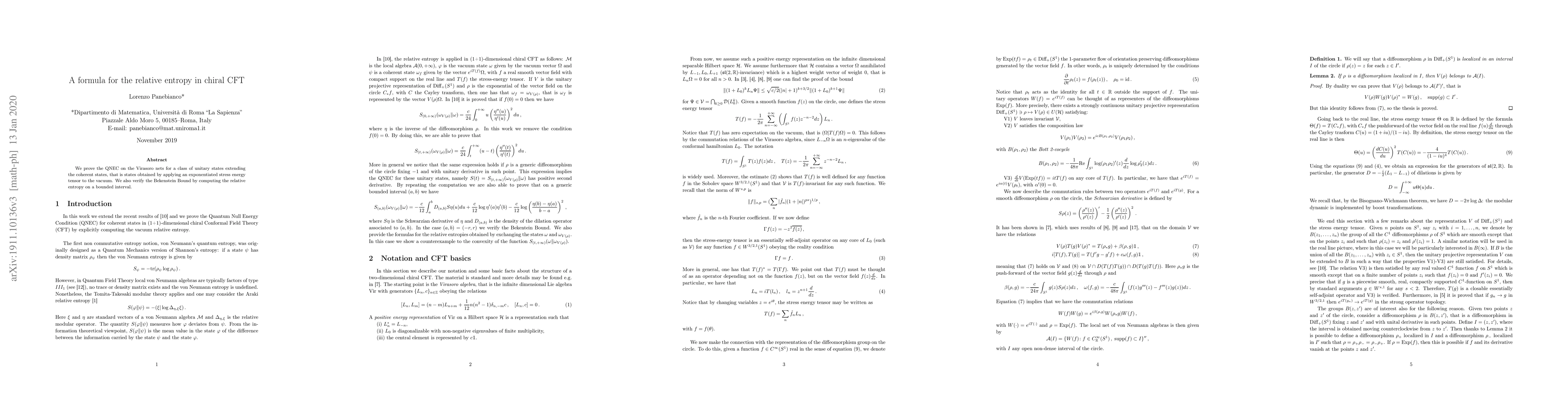 We give a general formula for the relative entropy between the vacuum state and a coherent state, that is a state obtained by applying an exponentiated stress energy tensor to the vacuum of a chiral conformal field theory on the lightray. As an application of this result, we verify the QNEC and the Bekenstein Bound.