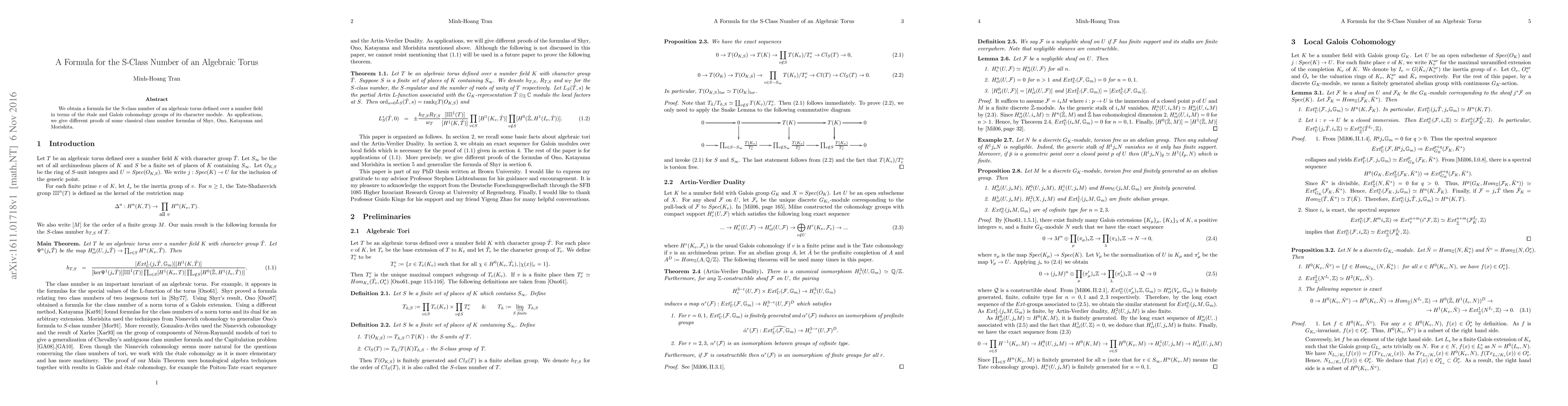 This paper derives a formula for the S-class number of algebraic tori over number fields using étale and Galois cohomology of character modules. It also provides new proofs for classical class number formulas established by Shyr, Ono, Katayama, and Morishita.