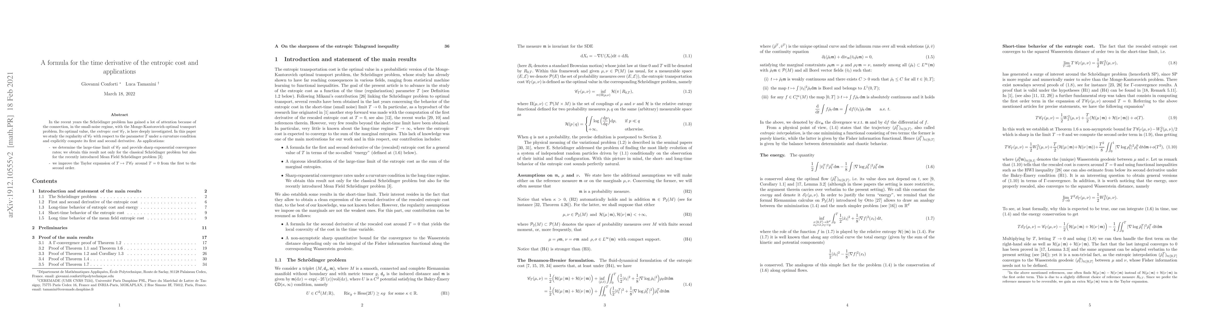 In the recent years the Schr\"odinger problem has gained a lot of attention because of the connection, in the small-noise regime, with the Monge-Kantorovich optimal transport problem. Its optimal value, the \emph{entropic cost} $\mathscr{C}_T$, is here deeply investigated. In this paper we study the regularity of $\mathscr{C}_T$ with respect to the parameter $T$ under a curvature condition and explicitly compute its first and second derivative. As applications: - we determine the large-time limit of $\mathscr{C}_T$ and provide sharp exponential convergence rates; we obtain this result not only for the classical Schr\"odinger problem but also for the recently introduced Mean Field Schr\"odinger problem [3]; - we improve the Taylor expansion of $T \mapsto T\mathscr{C}_T$ around $T=0$ from the first to the second order.