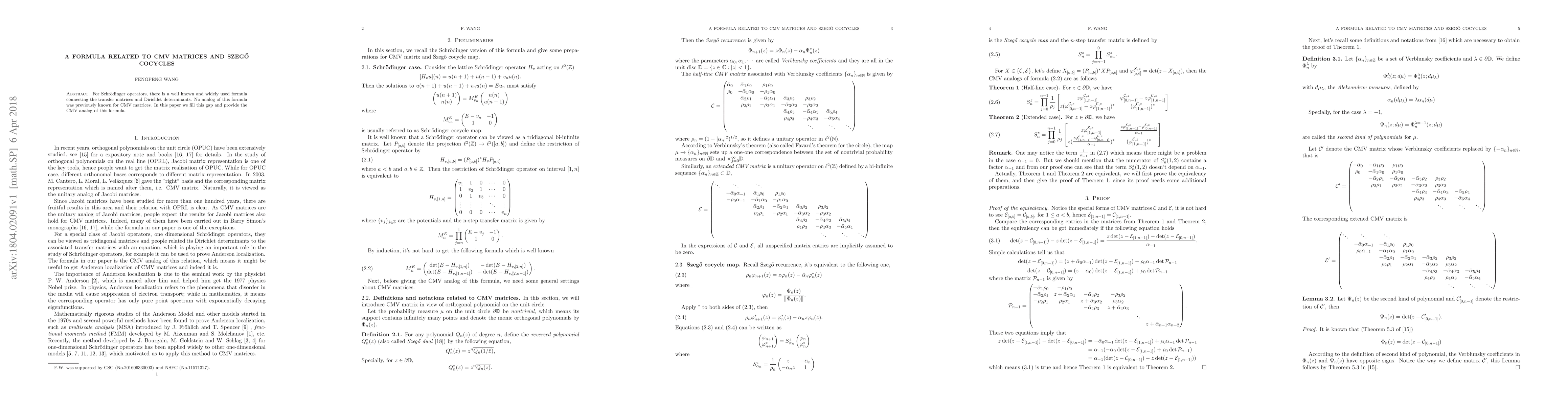 This paper introduces a new formula that parallels the well-known relationship between transfer matrices and Dirichlet determinants for Schrödinger operators, extending this connection to CMV matrices and Szegő cocycles. The result fills a significant gap in the existing literature on matrix representations in operator theory.