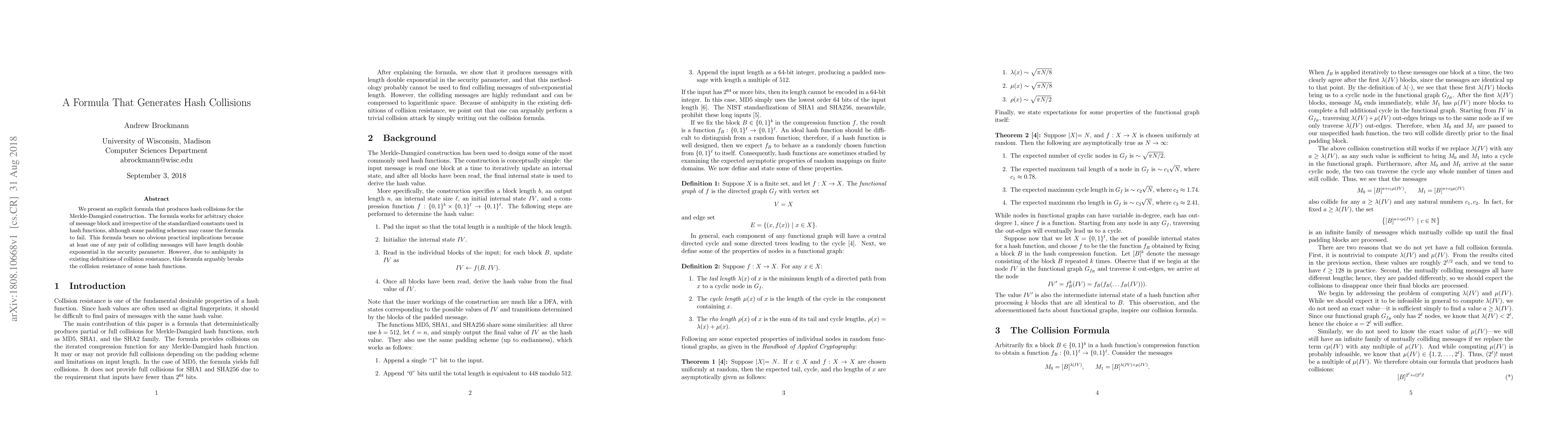 Researchers have found a formula that generates hash collisions for the Merkle-Damg{ t}{ø}rd construction, potentially breaking collision resistance in some hash functions.