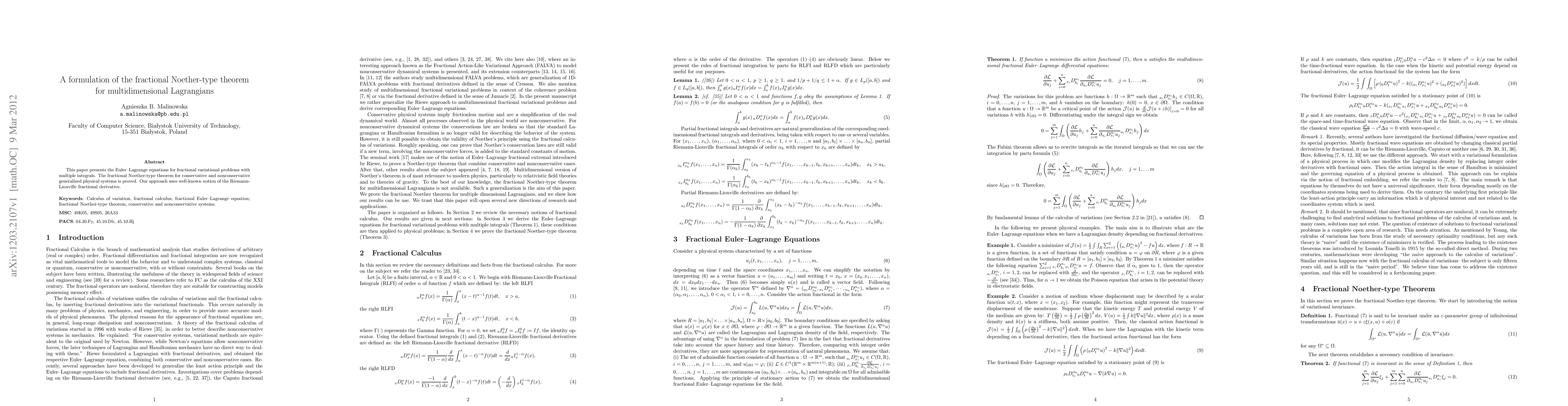 This paper proves the fractional Noether-type theorem for multidimensional Lagrangians using Riemann-Liouville fractional derivatives, applying it to both conservative and nonconservative systems.