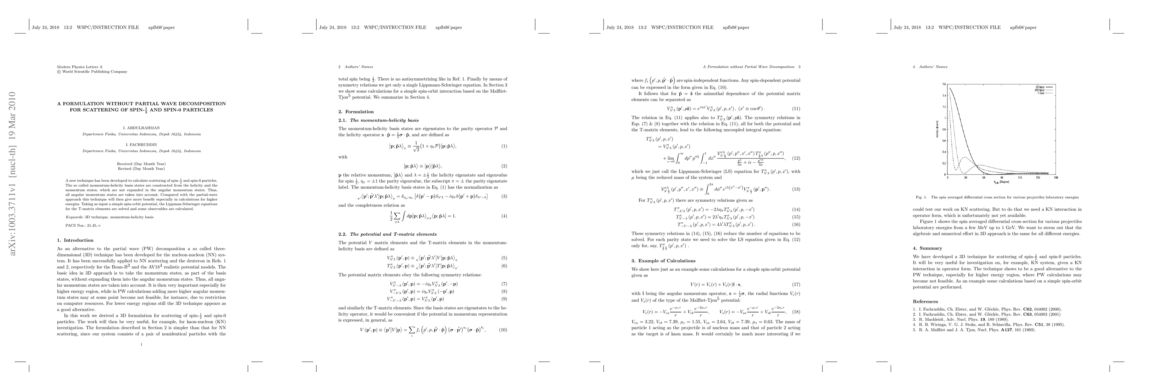 A new technique has been developed to calculate scattering of spin-1/2 and spin-0 particles. The so called momentum-helicity basis states are constructed from the helicity and the momentum states, which are not expanded in the angular momentum states. Thus, all angular momentum states are taken into account. Compared with the partial-wave approach this technique will then give more benefit especially in calculations for higher energies. Taking as input a simple spin-orbit potential, the Lippman-Schwinger equations for the T-matrix elements are solved and some observables are calculated.