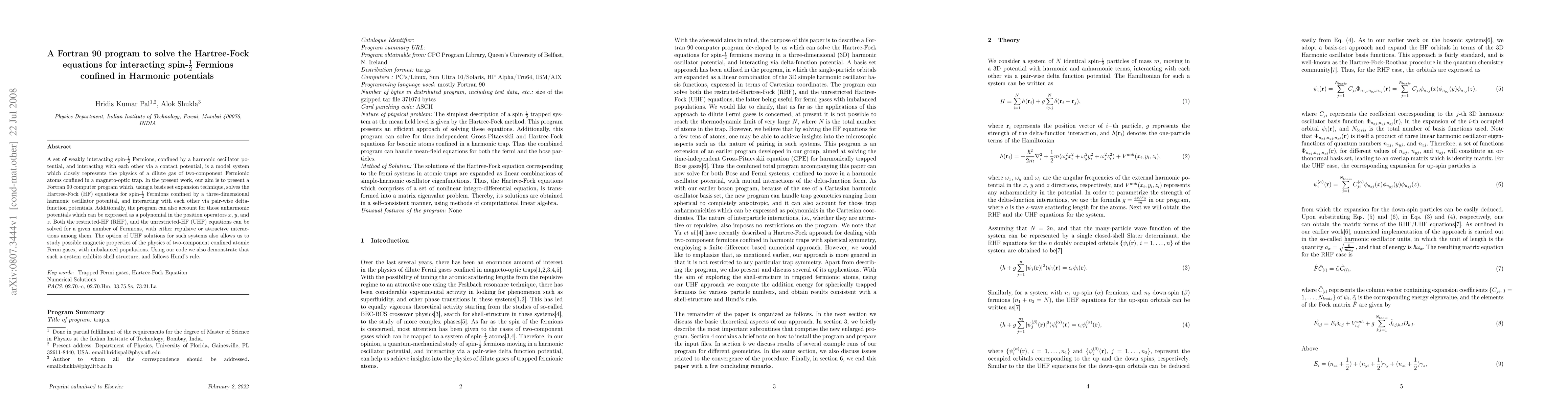 This paper presents a Fortran 90 program to solve the Hartree-Fock equations for spin-1/2 Fermions in a harmonic potential, using a basis set expansion. The program supports both restricted and unrestricted Hartree-Fock solutions for systems with various interaction types, and demonstrates shell structure and Hund's rule in confined atomic Fermi gases.