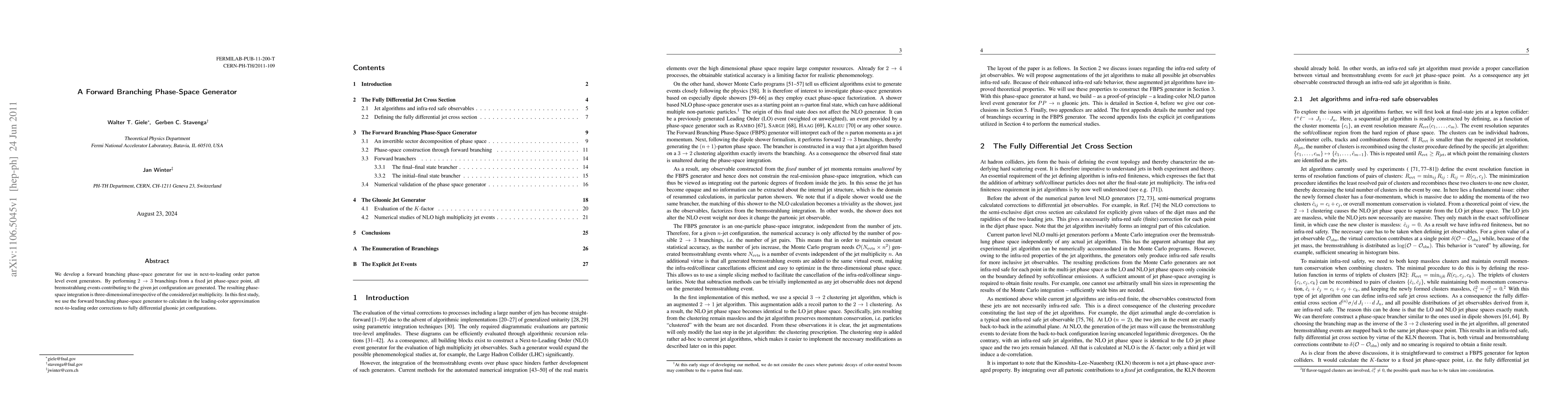 We develop a forward branching phase-space generator for use in next-to-leading order parton level event generators. By performing 2 -> 3 branchings from a fixed jet phase-space point, all bremsstrahlung events contributing to the given jet configuration are generated. The resulting phase-space integration is three-dimensional irrespective of the considered jet multiplicity. In this first study, we use the forward branching phase-space generator to calculate in the leading-color approximation next-to-leading order corrections to fully differential gluonic jet configurations.