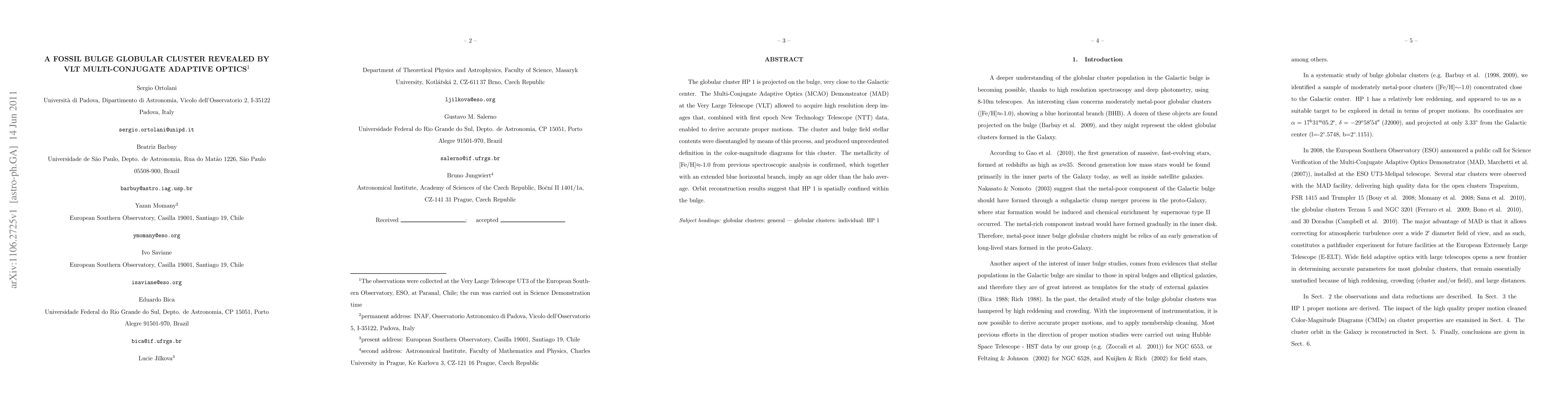 The globular cluster HP1 is projected on the bulge, very close to the Galactic center. The Multi-Conjugate Adaptive Optics (MCAO) Demonstrator (MAD) at the Very Large Telescope (VLT) allowed to acquire high resolution deep images that, combined with first epoch New Technology Telescope (NTT) data, enabled to derive accurate proper motions. The cluster and bulge field stellar contents were disentangled by means of this process, and produced unprecedented definition in the color-magnitude diagrams for this cluster. The metallicity of [Fe/H] ~ -1.0 from previous spectroscopic analysis is confirmed, which together with an extended blue horizontal branch, imply an age older than the halo average. Orbit reconstruction results suggest that HP1 is spatially confined within the bulge.