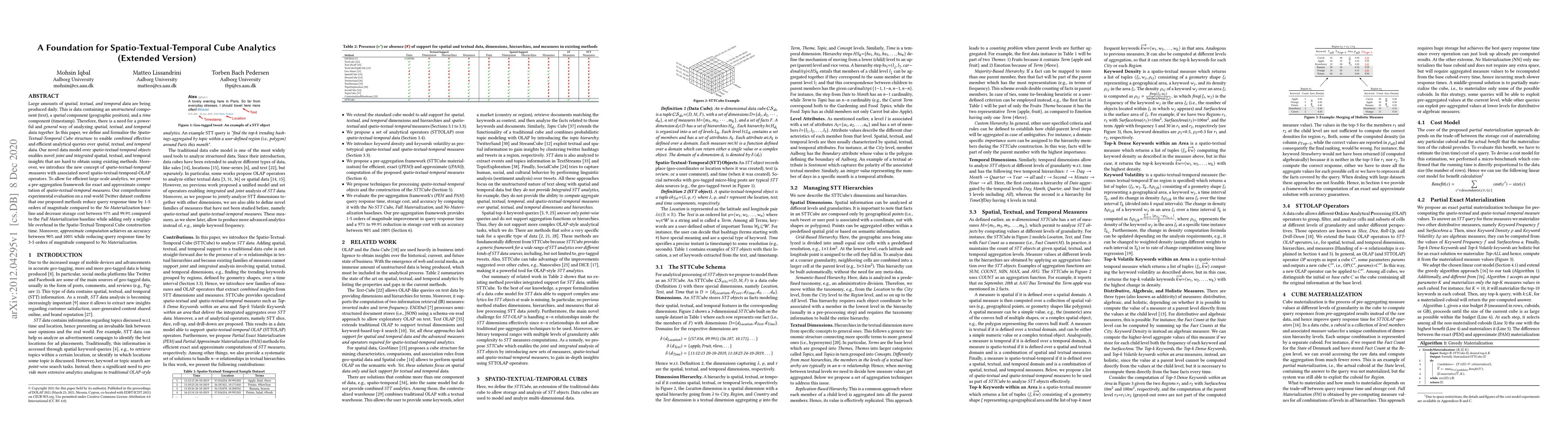 This paper introduces the Spatio-Textual-Temporal Cube structure for analyzing combined spatial, textual, and temporal data, proposing new spatio-textual-temporal measures and OLAP operators. Experimental results show significant improvements in query response time and storage efficiency compared to existing methods.