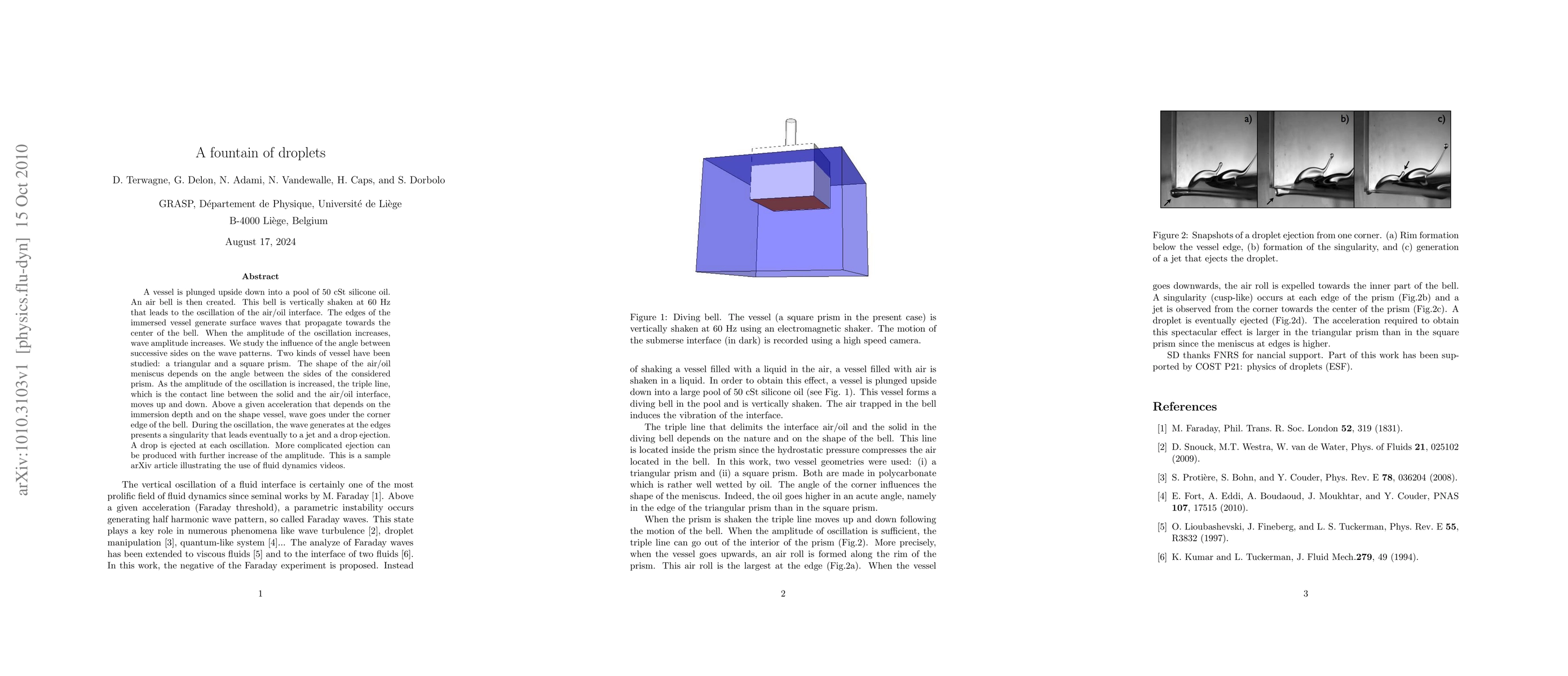 A vessel is plunged upside down into a pool of 50 cSt silicone oil. An air bell is then created. This bell is vertically shaken at 60 Hz that leads to the oscillation of the air/oil interface. The edges of the immersed vessel generate surface waves that propagate towards the center of the bell. When the amplitude of the oscillation increases, wave amplitude increases. We study the influence of the angle between successive sides on the wave patterns. Two kinds of vessel have been studied: a triangular and a square prism. The shape of the air/oil meniscus depends on the angle between the sides of the considered prism. As the amplitude of the oscillation is increased, the triple line, which is the contact line between the solid and the air/oil interface, moves up and down. Above a given acceleration that depends on the immersion depth and on the shape vessel, wave goes under the corner edge of the bell. During the oscillation, the wave generates at the edges presents a singularity that leads eventually to a jet and a drop ejection. A drop is ejected at each oscillation. More complicated ejection can be produced with further increase of the amplitude. This is a sample arXiv article illustrating the use of fluid dynamics videos.