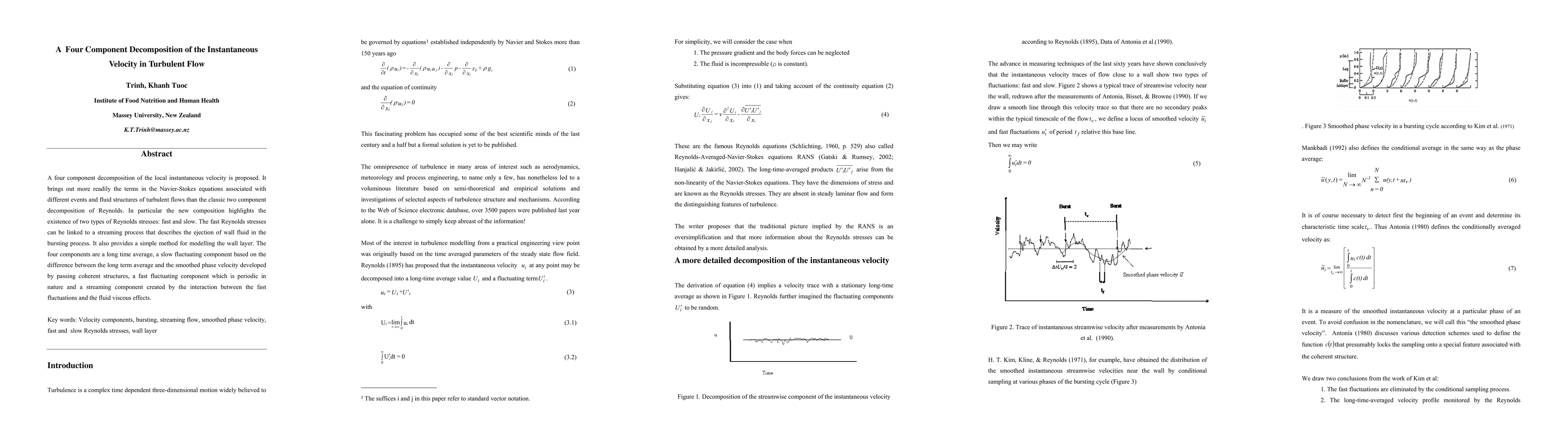 A four component decomposition of the local instantaneous velocity is proposed. It brings out more readily the terms in the Navier-Stokes equations associated with different events and fluid structures of turbulent flows than the classic two component decomposition of Reynolds. In particular the new composition highlights the existence of two types of Reynolds stresses: fast and slow. The fast Reynolds stresses can be linked to a streaming process that describes the ejection of wall fluid in the bursting process. It also provides a simple method for modelling the wall layer. The four components are a long time average, a slow fluctuating component based on the difference between the long term average and the smoothed phase velocity developed by passing coherent structures, a fast fluctuating component which is periodic in nature and a streaming component created by the interaction between the fast fluctuations and the fluid viscous effects. Key words: Velocity components, bursting, streaming flow, smoothed phase velocity, fast and slow Reynolds stresses, wall layer