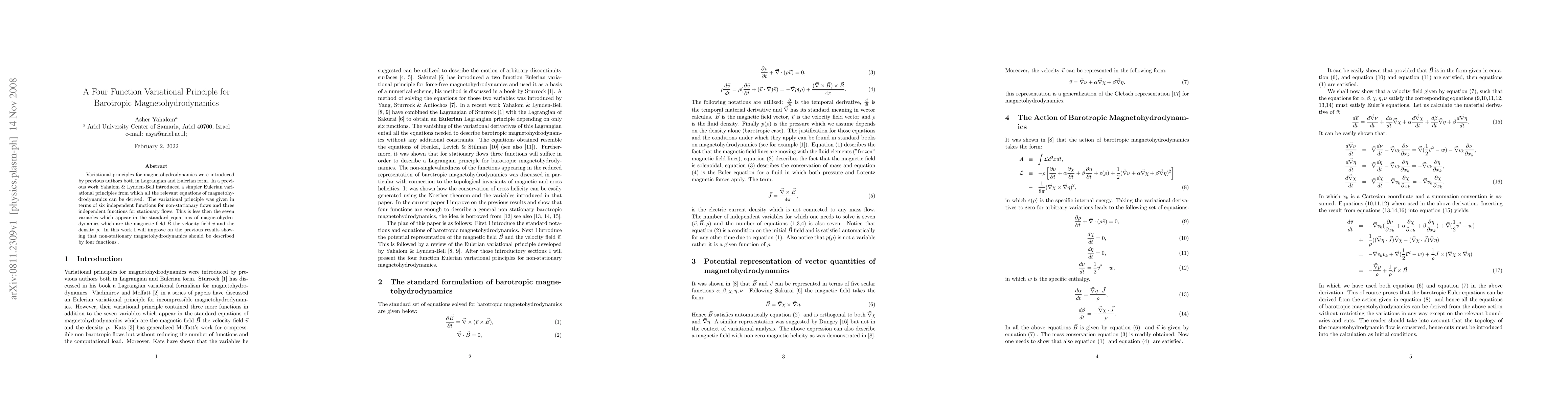 This paper proposes a four-function variational principle for barotropic magnetohydrodynamics, improving upon previous six-function formulations by reducing complexity while maintaining the derivation of all relevant equations. This simplification aligns the number of independent functions with the number of variables in the standard equations.